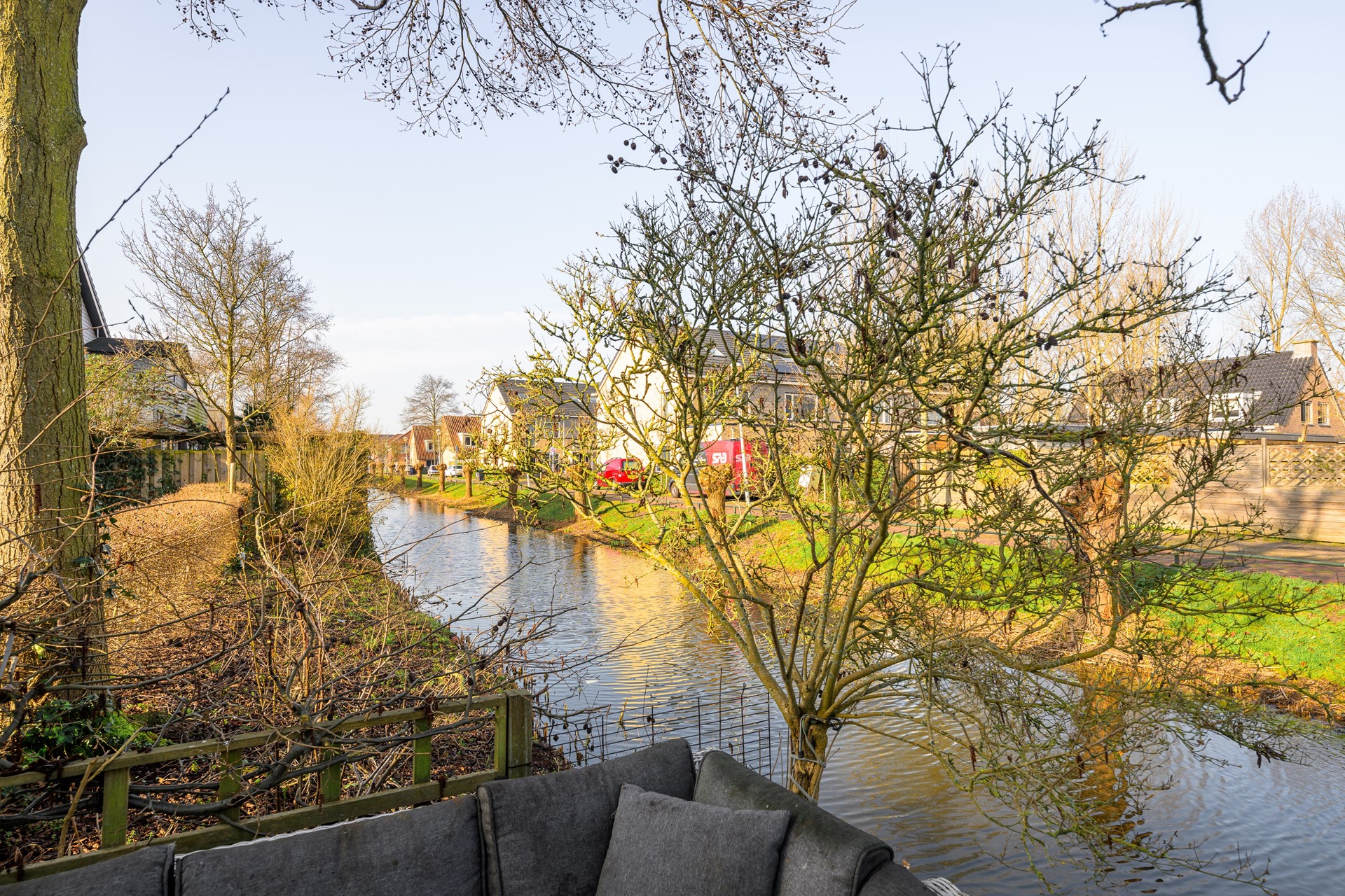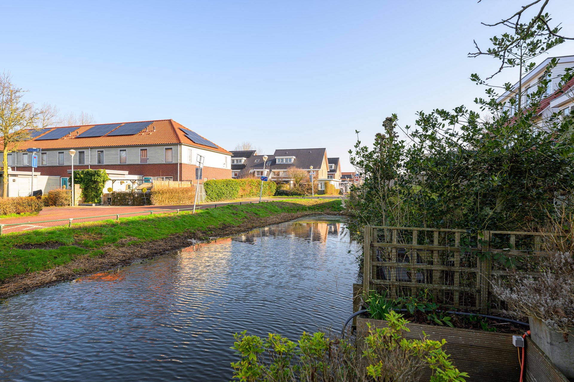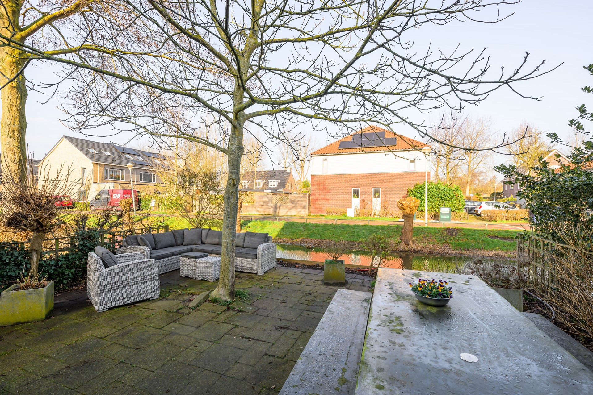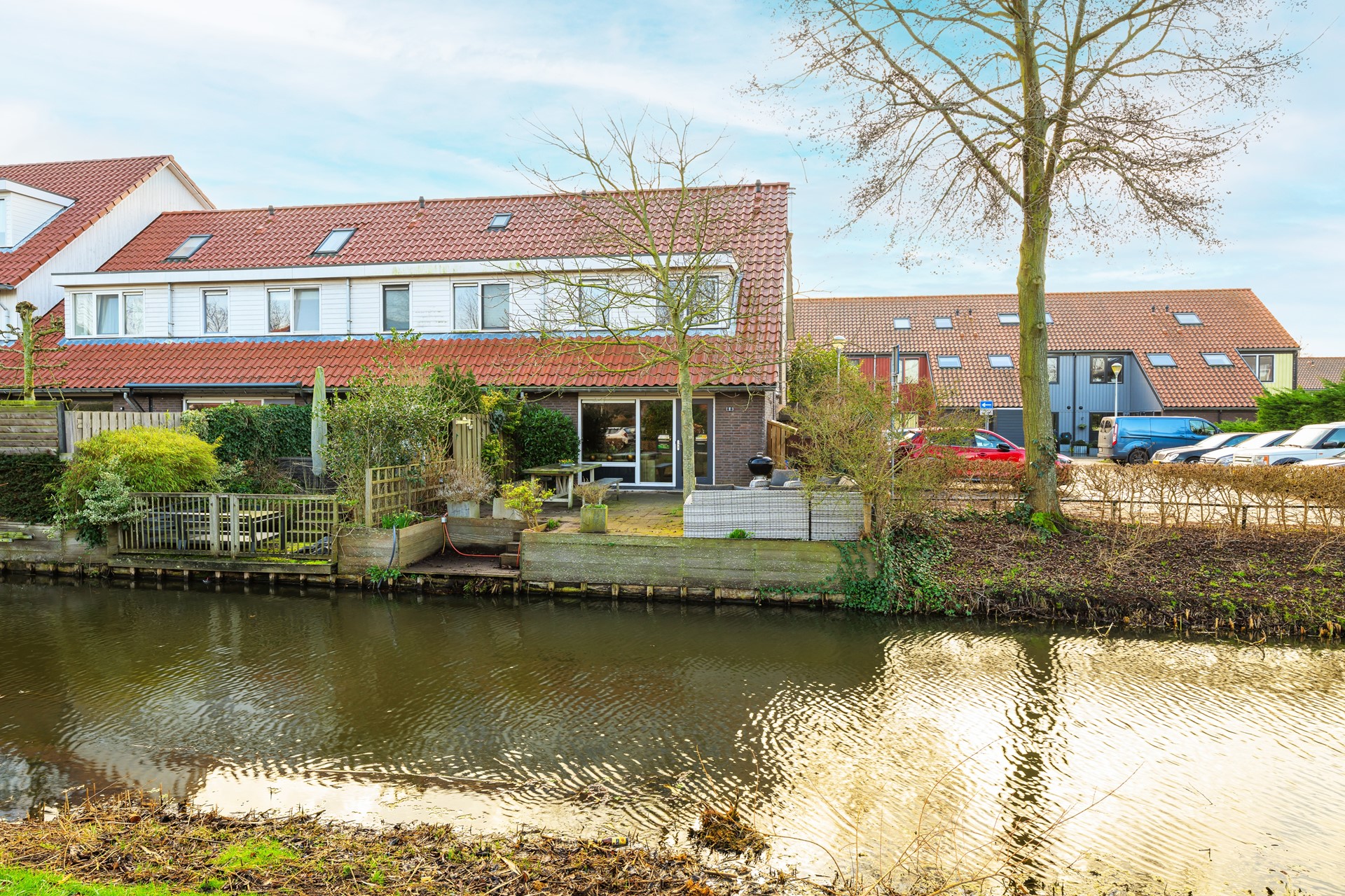 De achtertuin ligt direct aan het water en biedt een heerlijk vrij uitzicht. Hier kunt u genieten van rust, groen en privacy. Een ideale plek om te ontspannen, buiten te eten of te genieten van lange zomeravonden aan het water.