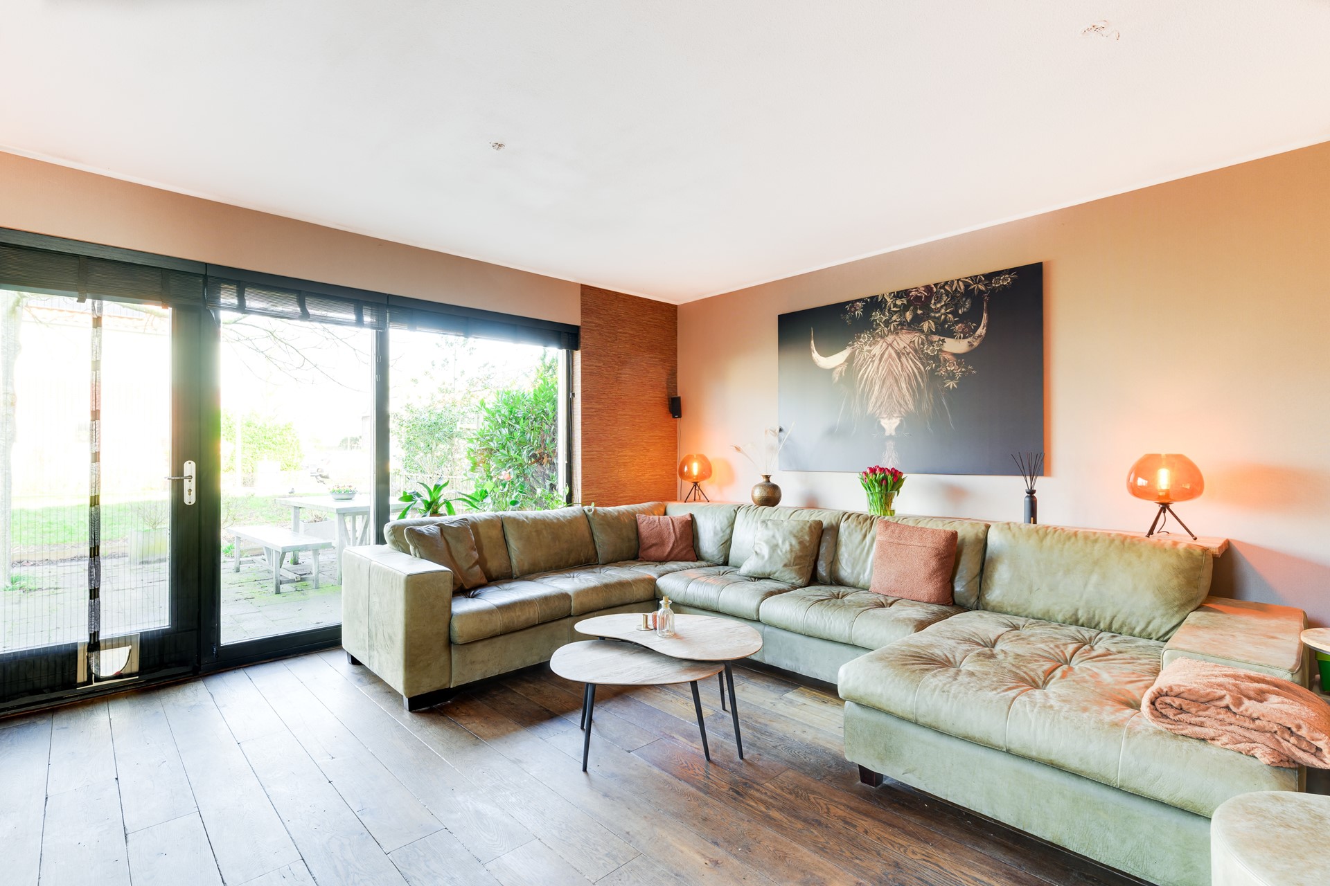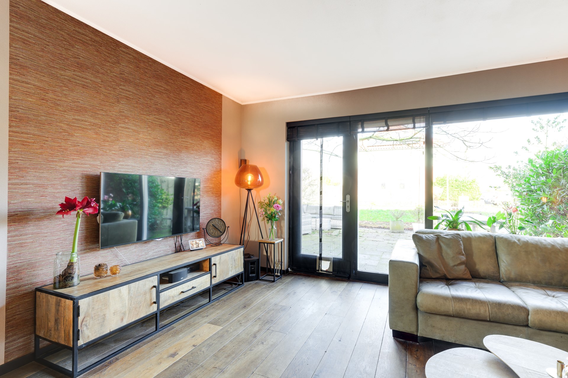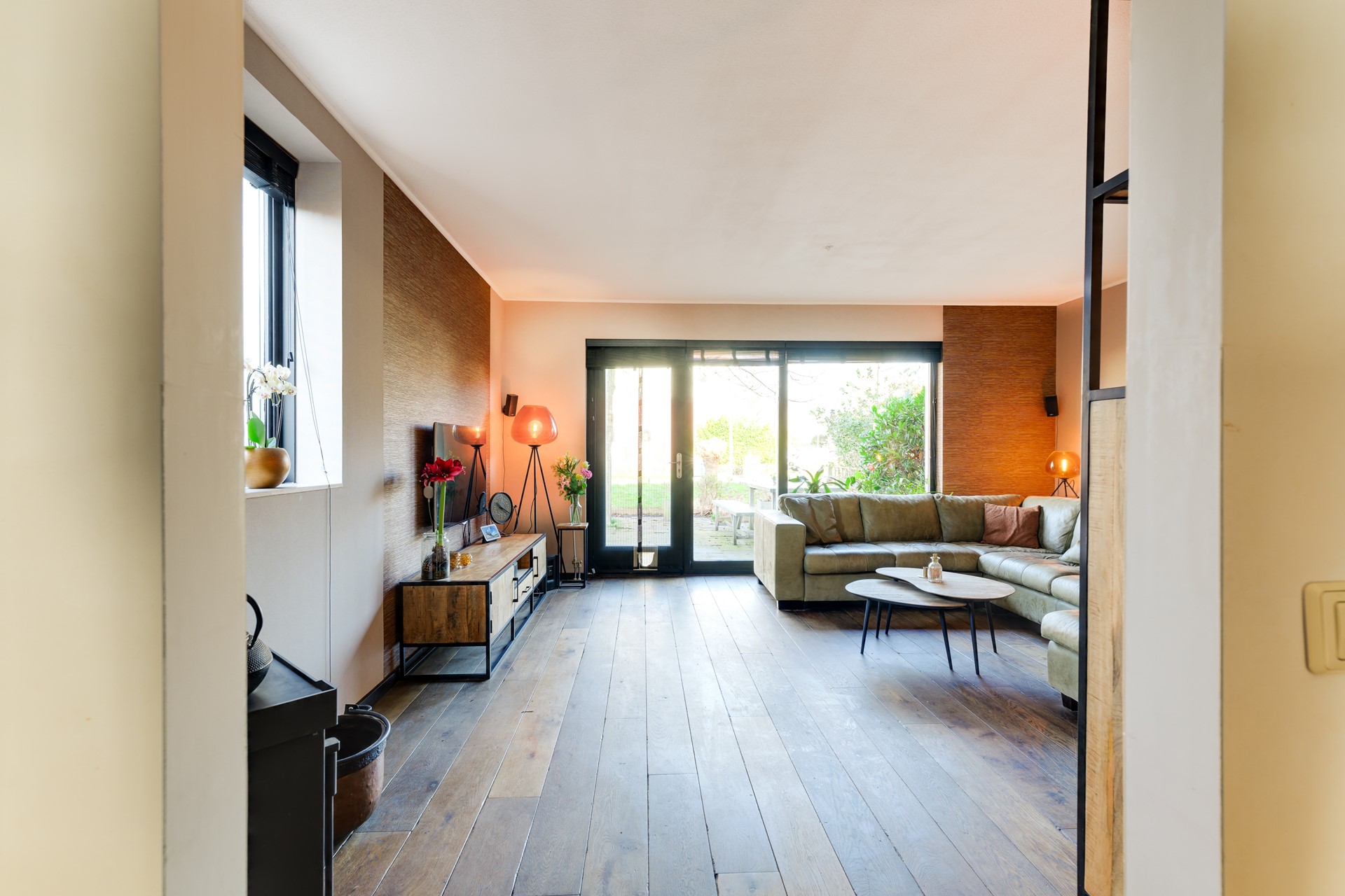 Aan de achterzijde van de woning ligt de sfeervolle woonkamer met veel lichtinval en directe toegang tot de achtertuin. Vanuit de woonkamer kijkt u uit over het water en het groen, wat zorgt voor een rustige en vrije woonbeleving.