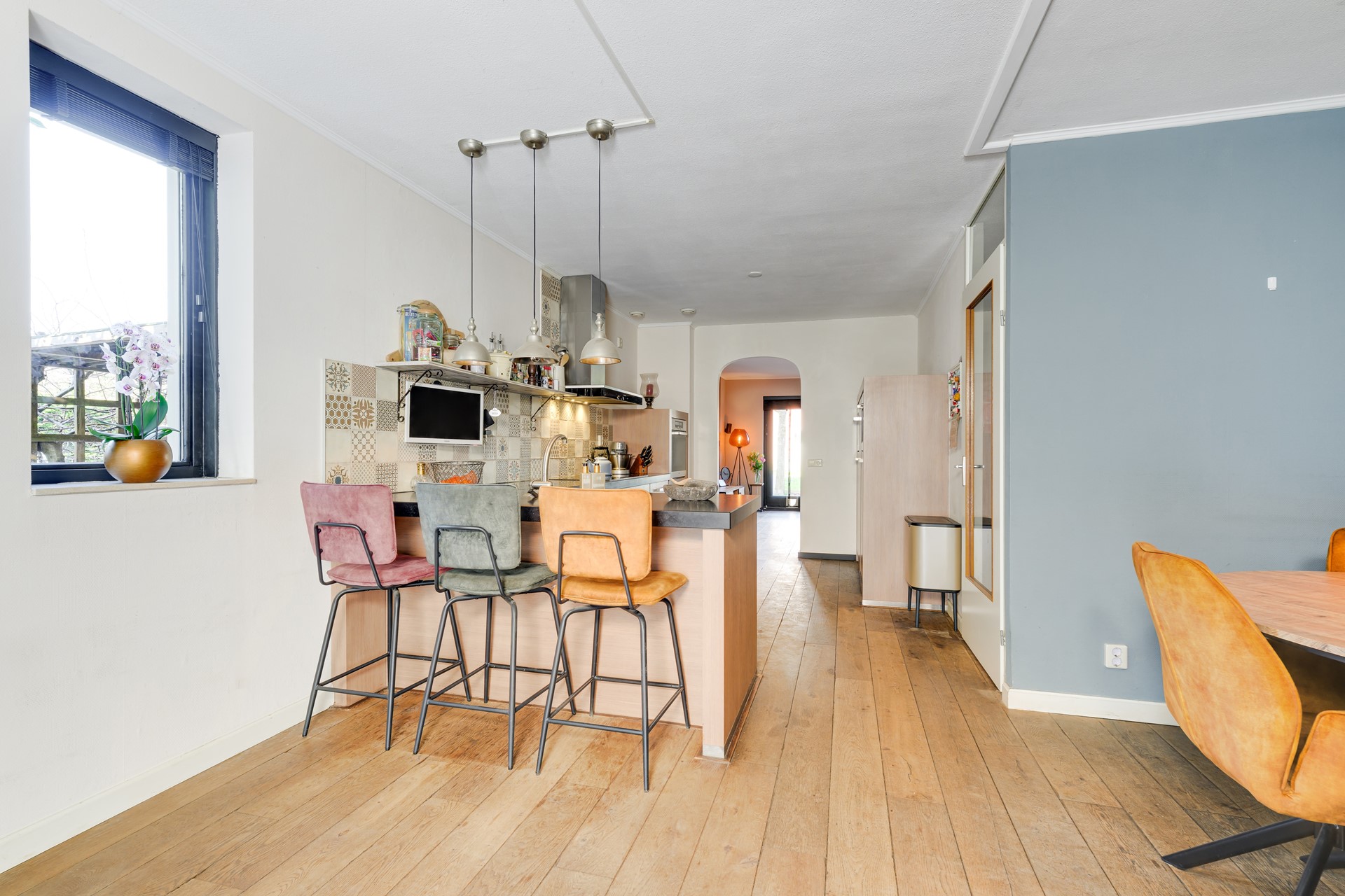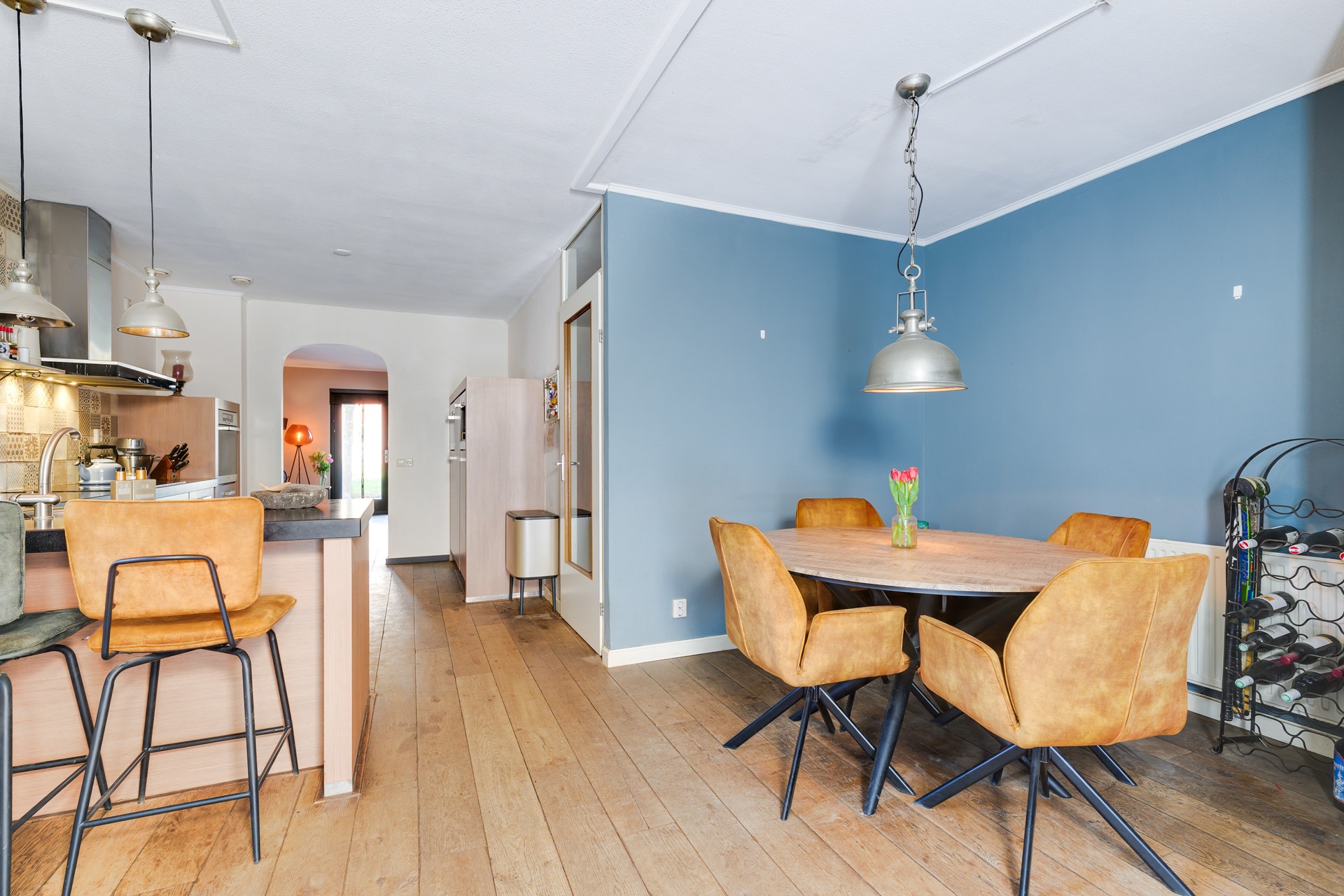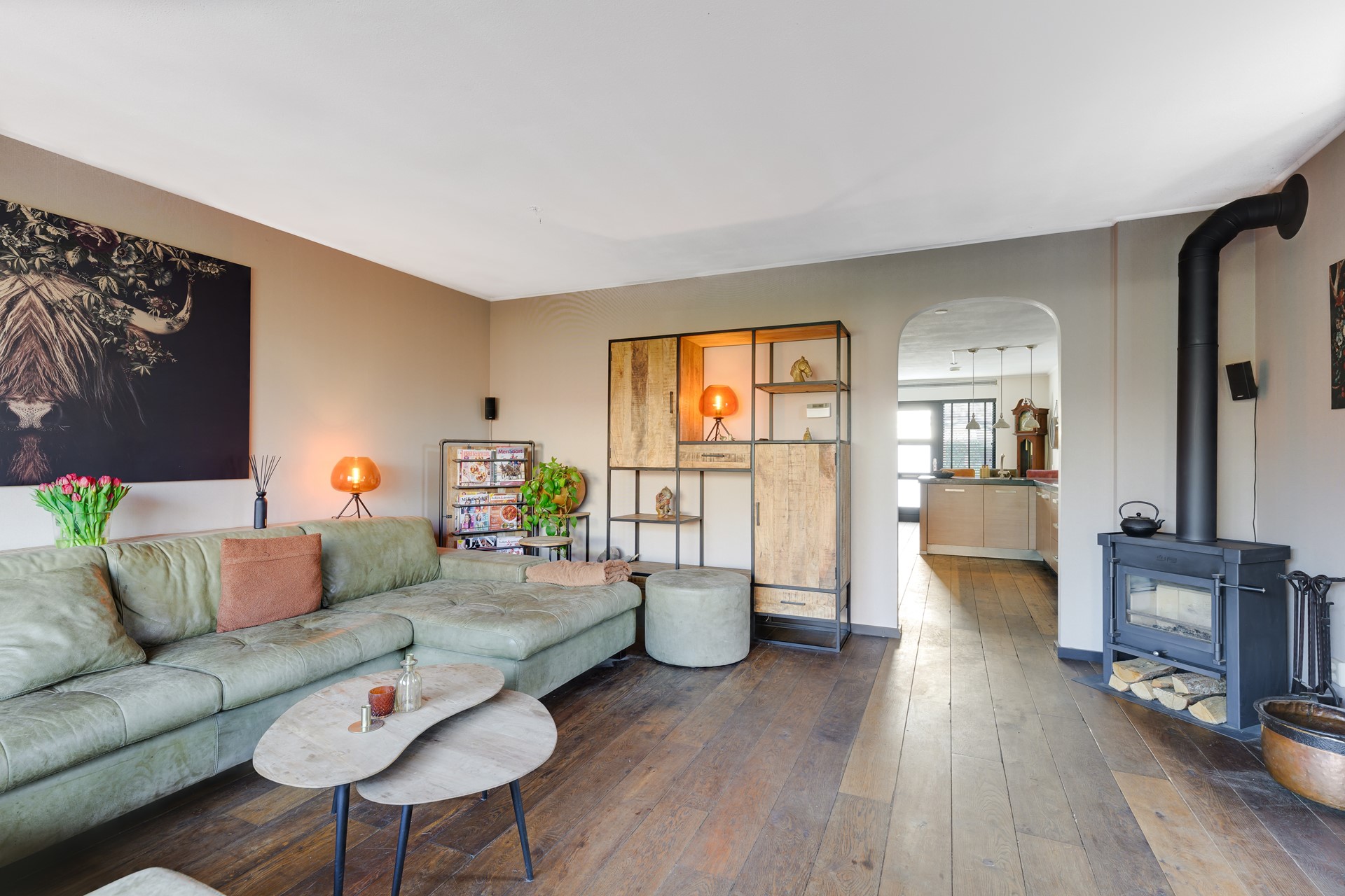 Aan de achterzijde van de woning ligt de sfeervolle woonkamer met veel lichtinval en directe toegang tot de achtertuin. Vanuit de woonkamer kijkt u uit over het water en het groen, wat zorgt voor een rustige en vrije woonbeleving.