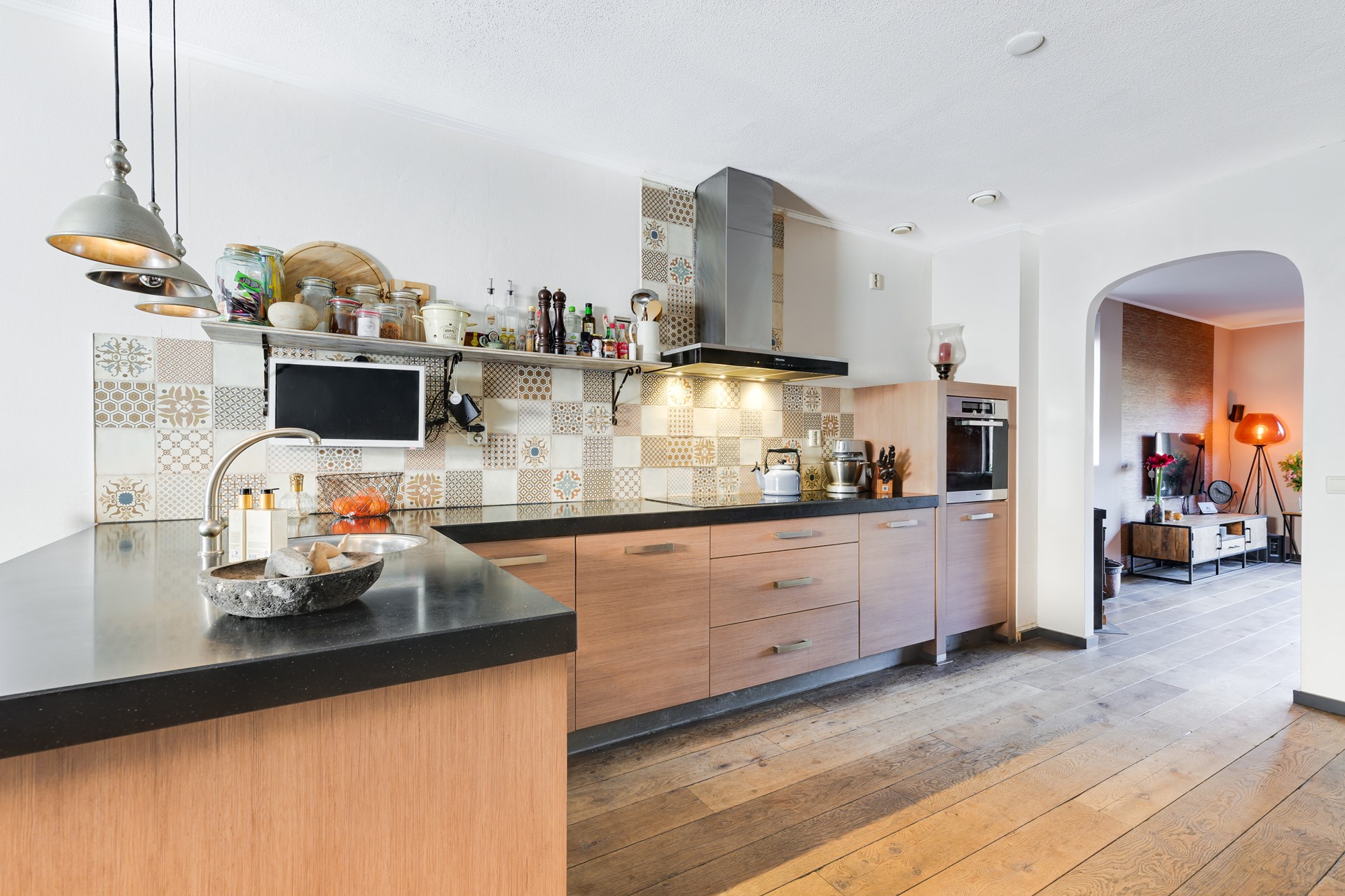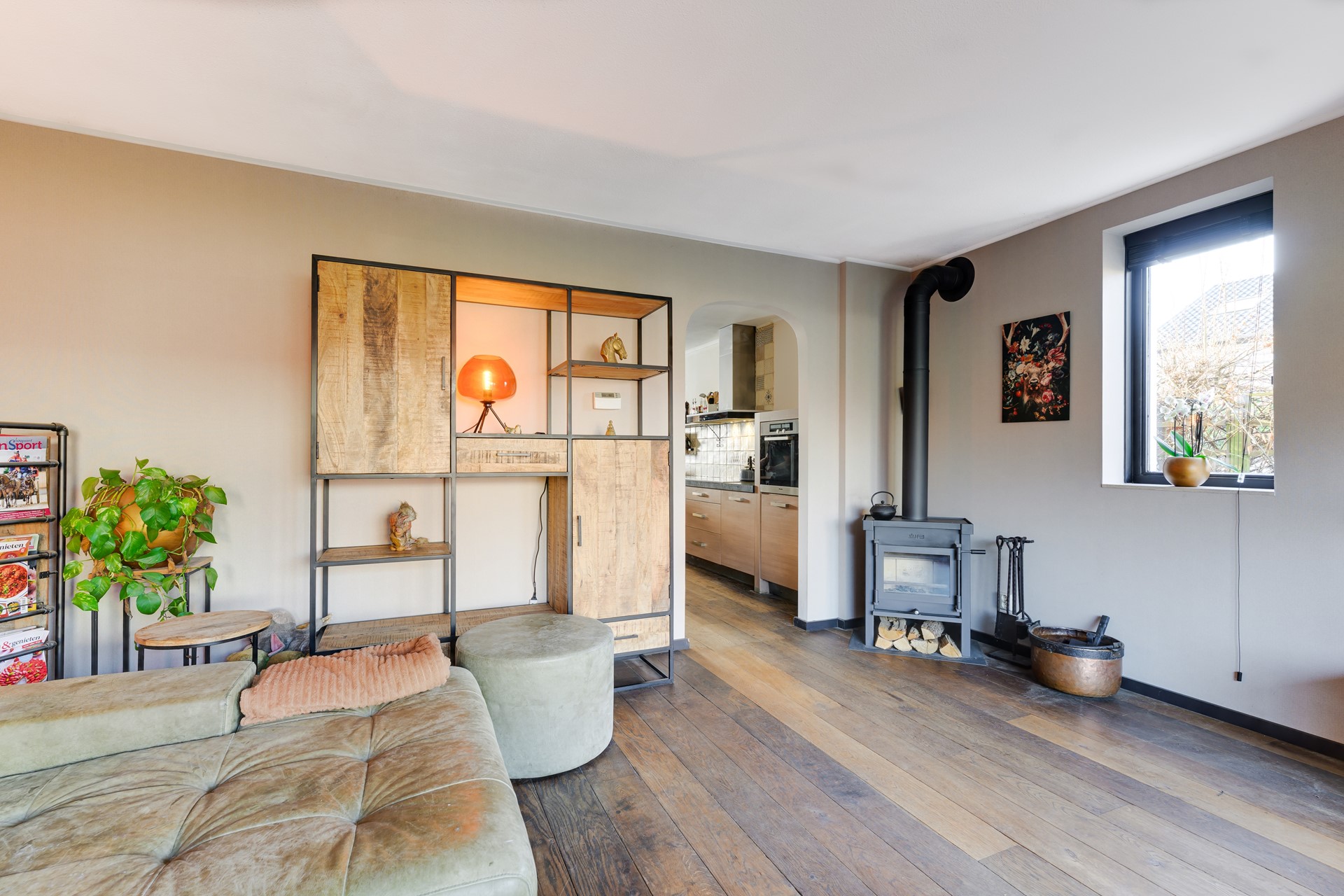 De open keuken bevindt zich aan de voorzijde van de woning en biedt voldoende werkruimte en opbergmogelijkheden. Aansluitend is er een praktische berging in de tuin.