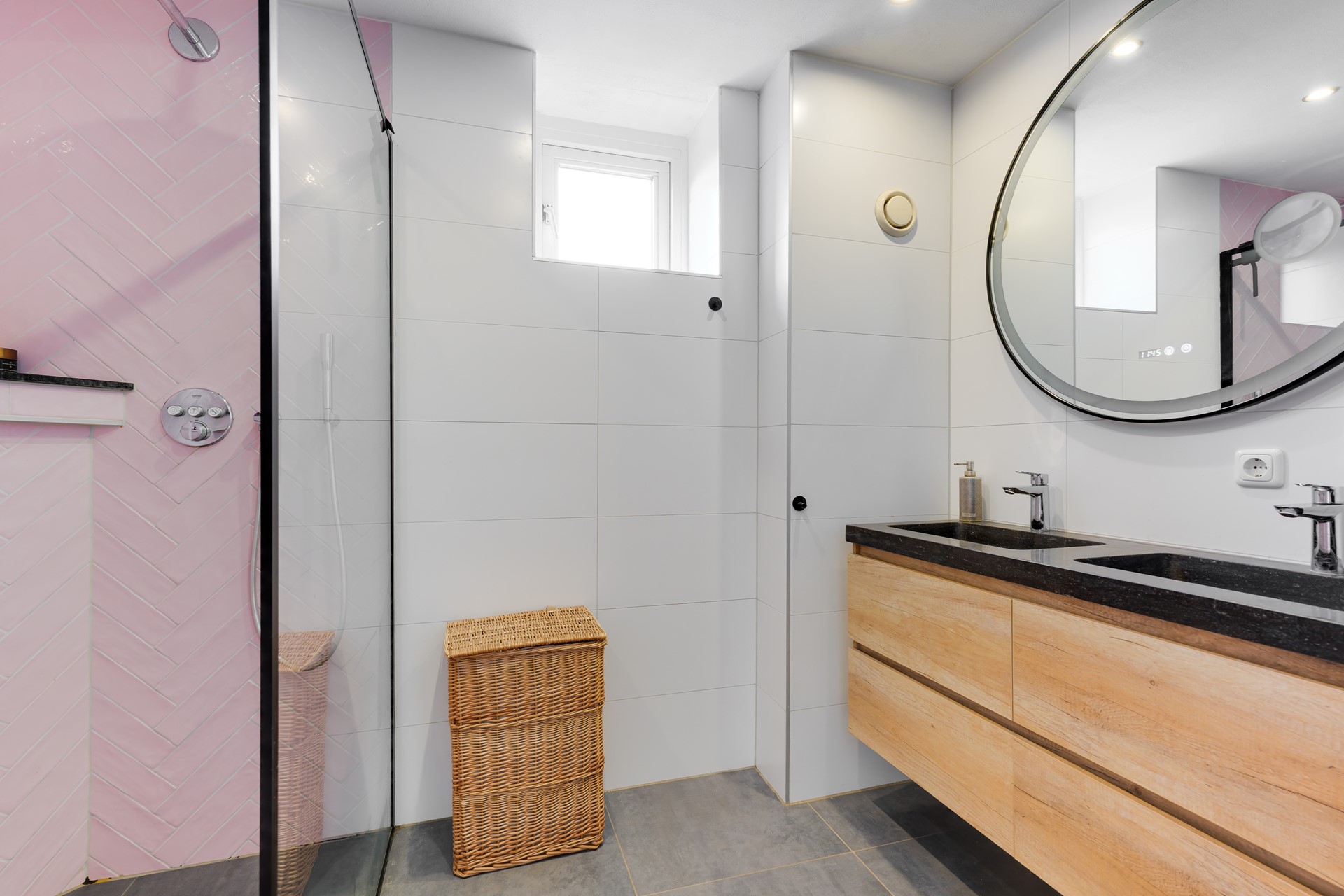 De badkamer is stijlvol uitgevoerd met een ruime inloopdouche met fraaie tegelwand, een dubbele wastafel met meubel en moderne afwerking.
