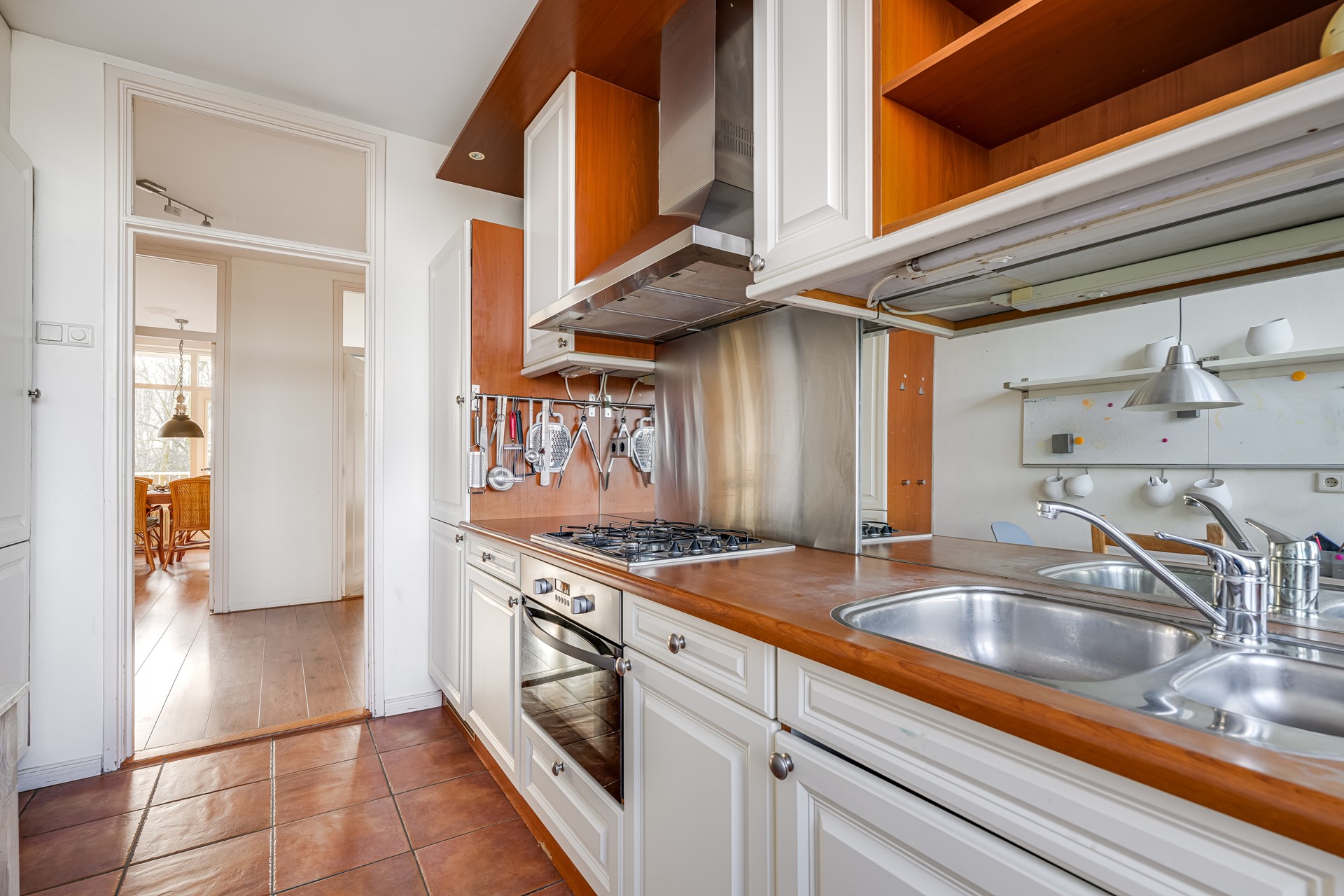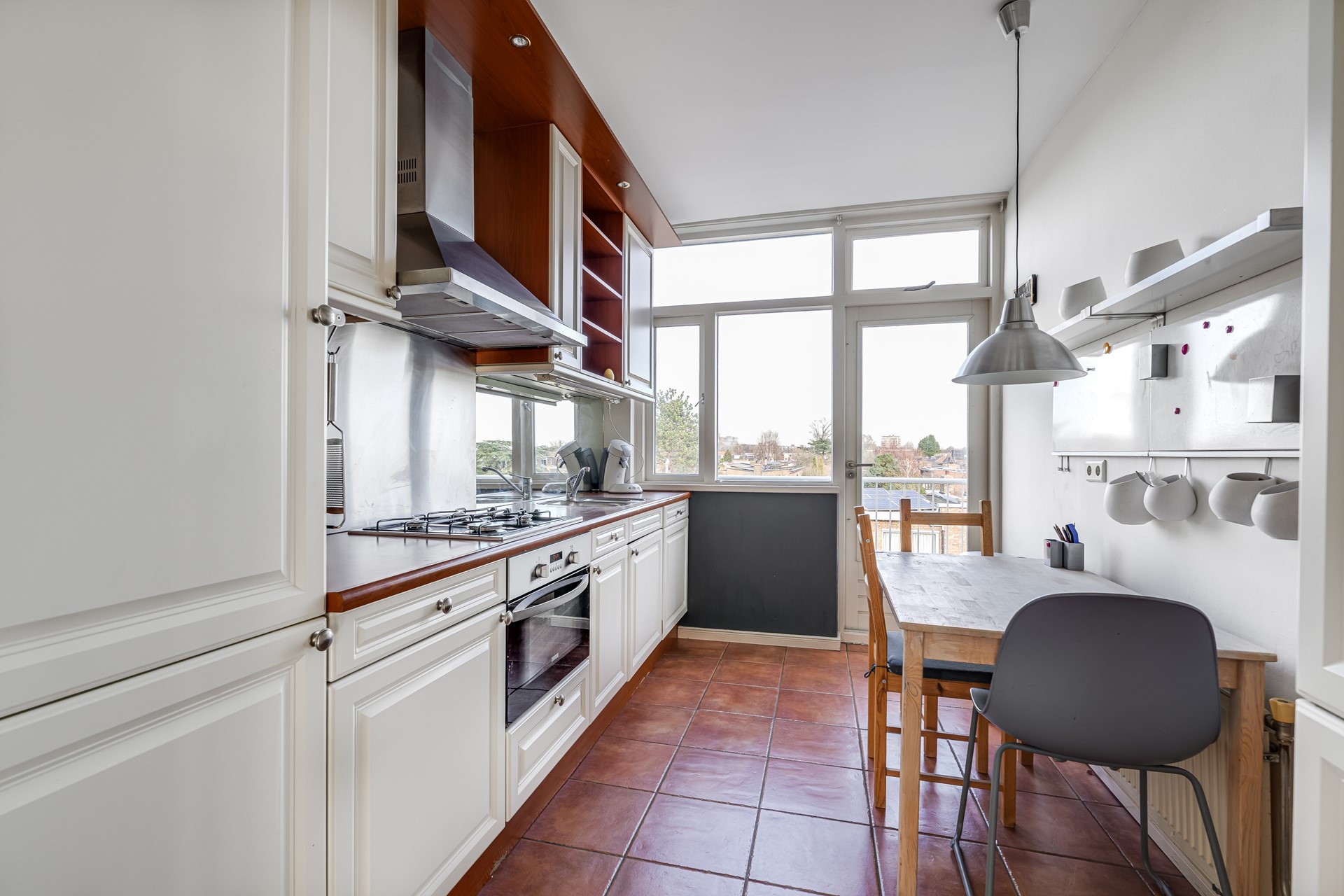 De mooie keuken is praktisch ingericht, beschikt over inbouwapparatuur en heeft eveneens toegang tot het tweede balkon. (Hierdoor ontstaat een prettige verbinding tussen binnen en buiten, ideaal voor wie graag licht en lucht in huis haalt.)