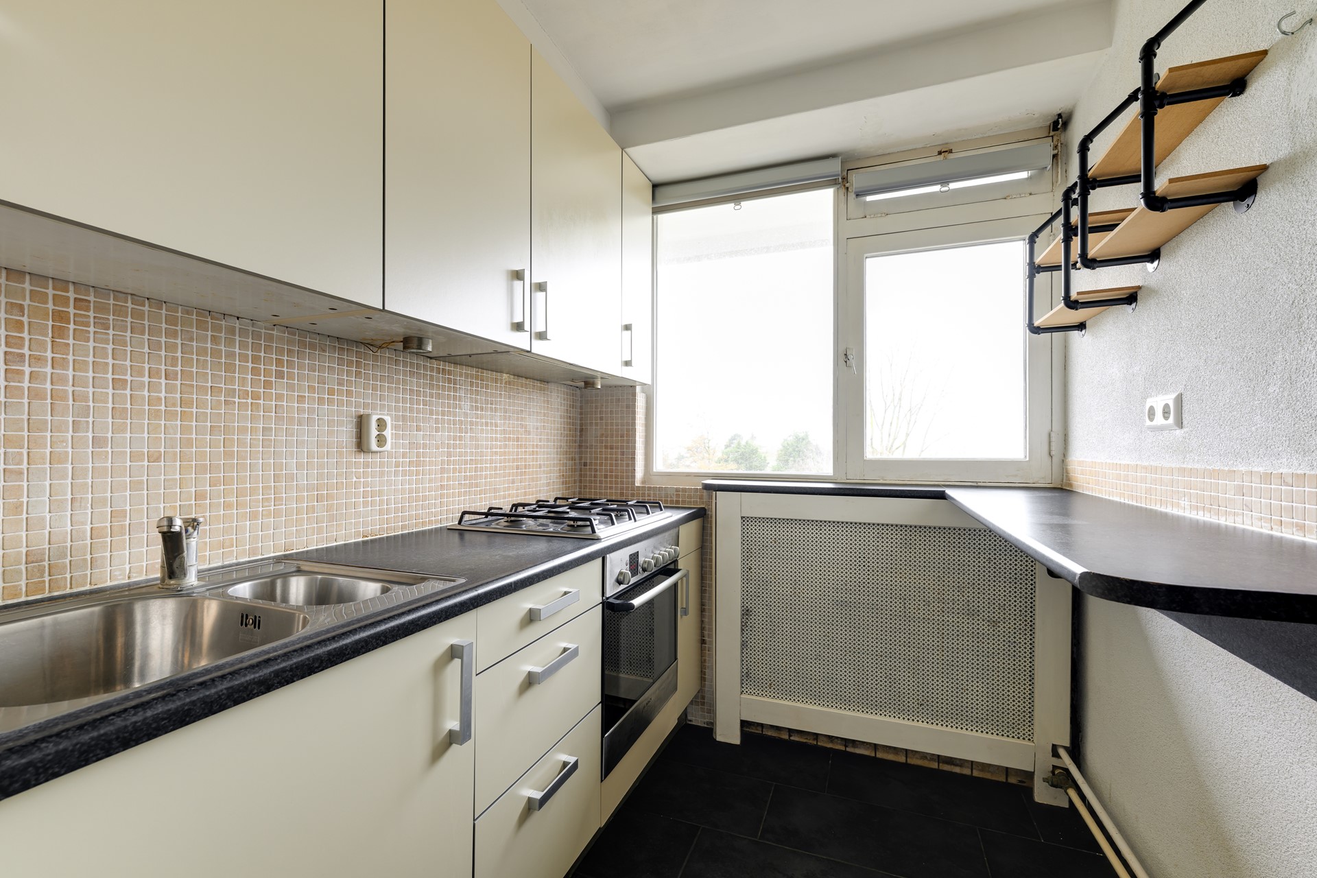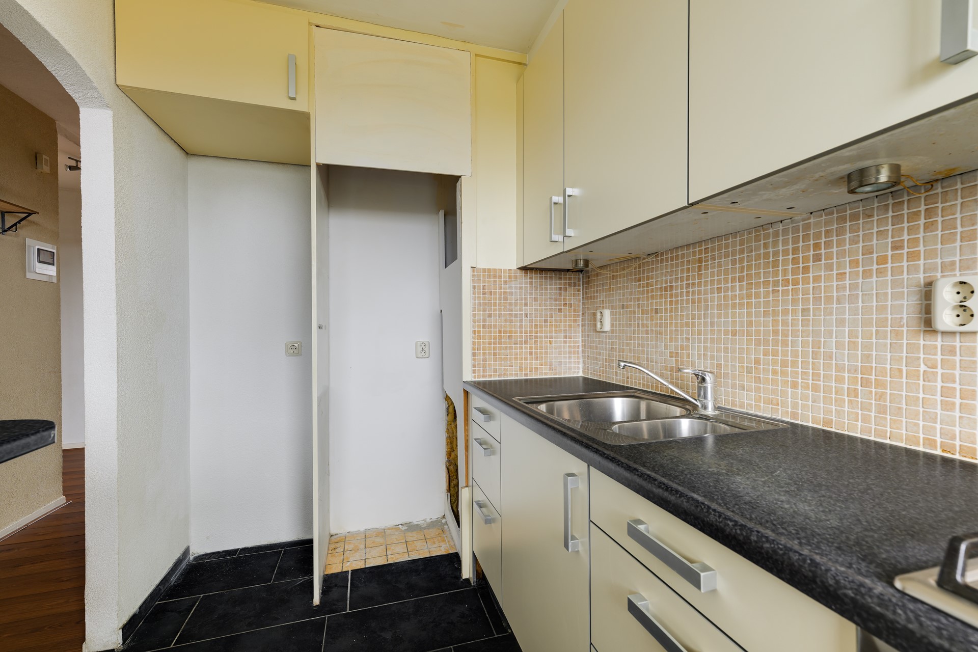 De keuken bevindt zich aan de galerijzijde en is praktisch ingericht met inbouwapparatuur en aansluiting voor de wasmachine.