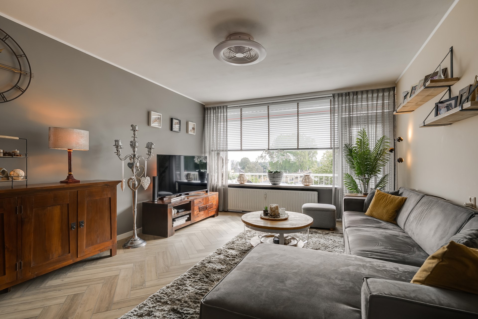 Royale woonkamer met grote raampartijen en veel lichtinval