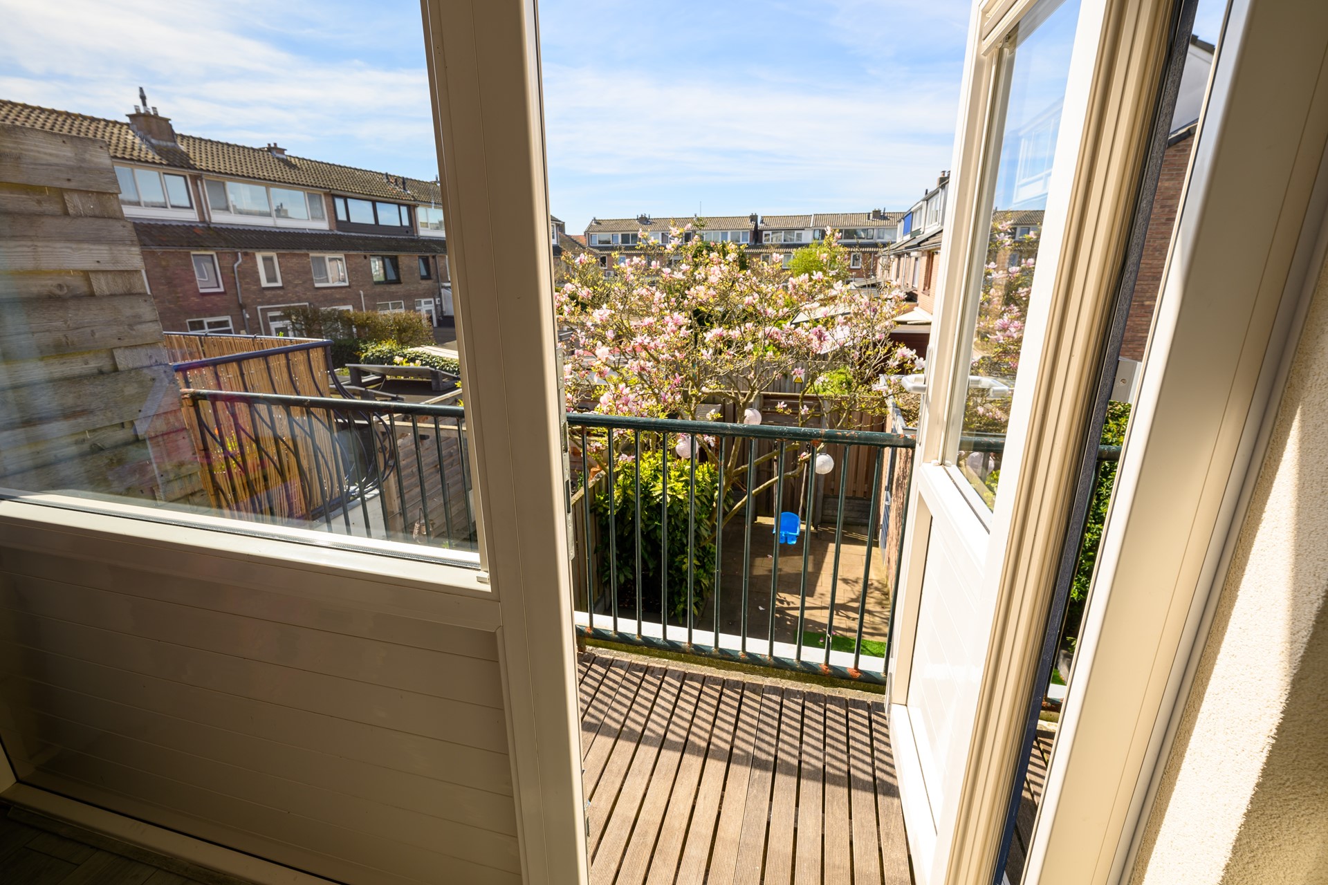 Ook is er een balkon waar je ’s ochtends even rustig wakker kunt worden met koffie en uitzicht op de bloeiende Magnolia in de tuin.