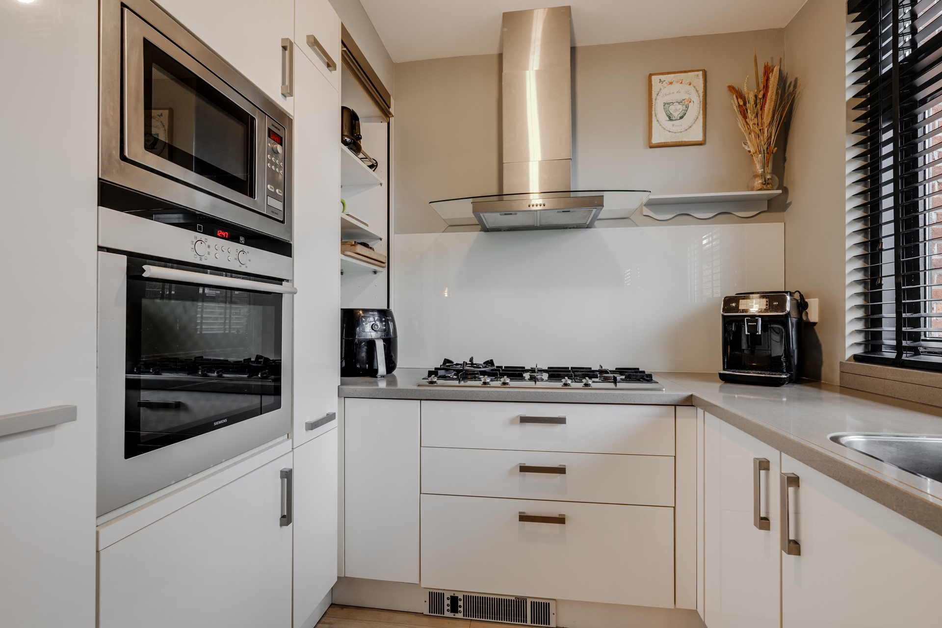 De open keuken bevindt zich aan de achterzijde van de woning en is praktisch ingericht. De keuken is uitgevoerd in een lichte opstelling en voorzien van diverse inbouwapparatuur, waaronder een gaskookplaat, afzuigkap, oven, koelkast en voldoende kastruimte. Dankzij het raam geniet je hier van prettig daglicht en contact met de tuin.