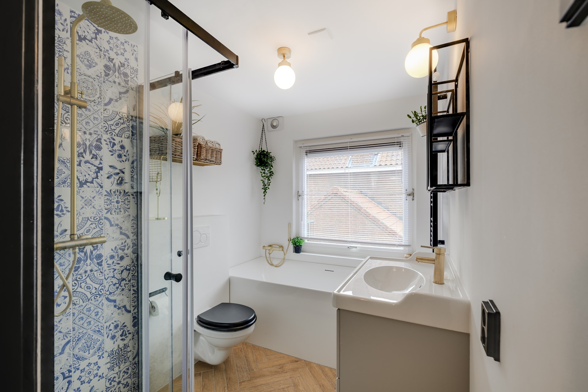 De badkamer is functioneel ingericht en voorzien van een ligbad met douche, wastafel en mechanische ventilatie.