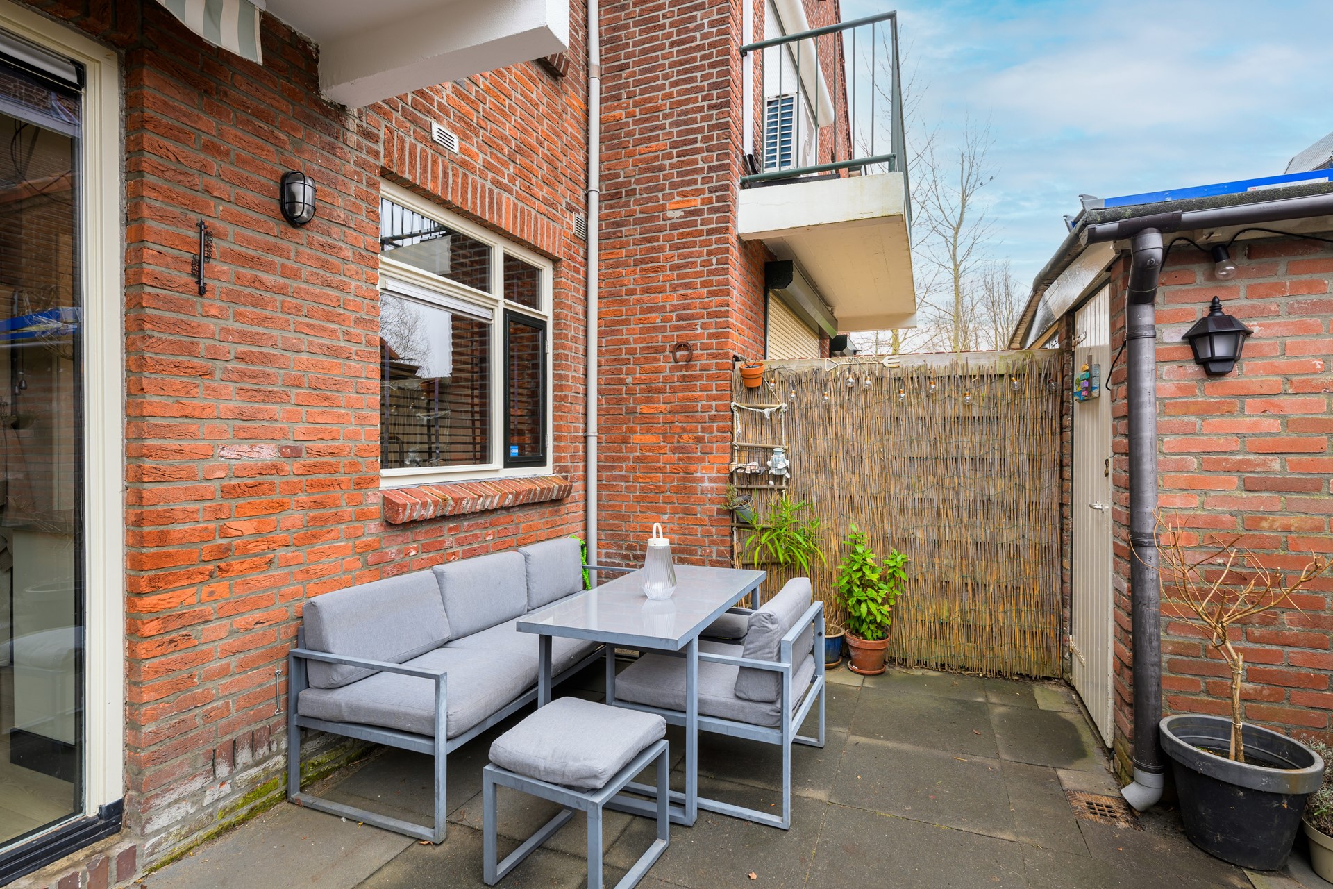 De achtertuin is een fijne, beschutte plek waar je rustig kunt zitten, eten of genieten van het buitenleven. Achterin bevindt zich een berging voor fietsen en opslag.