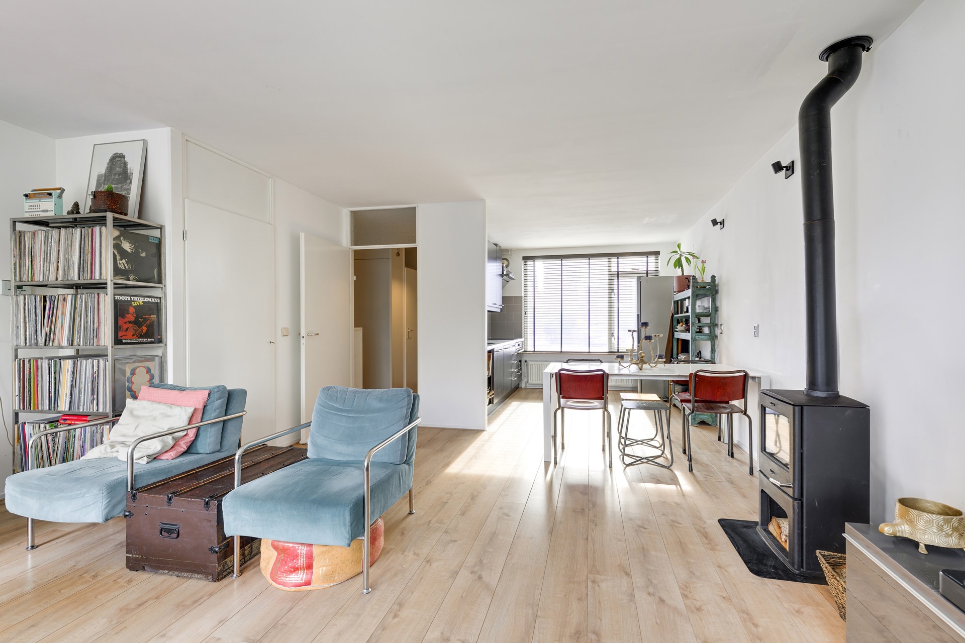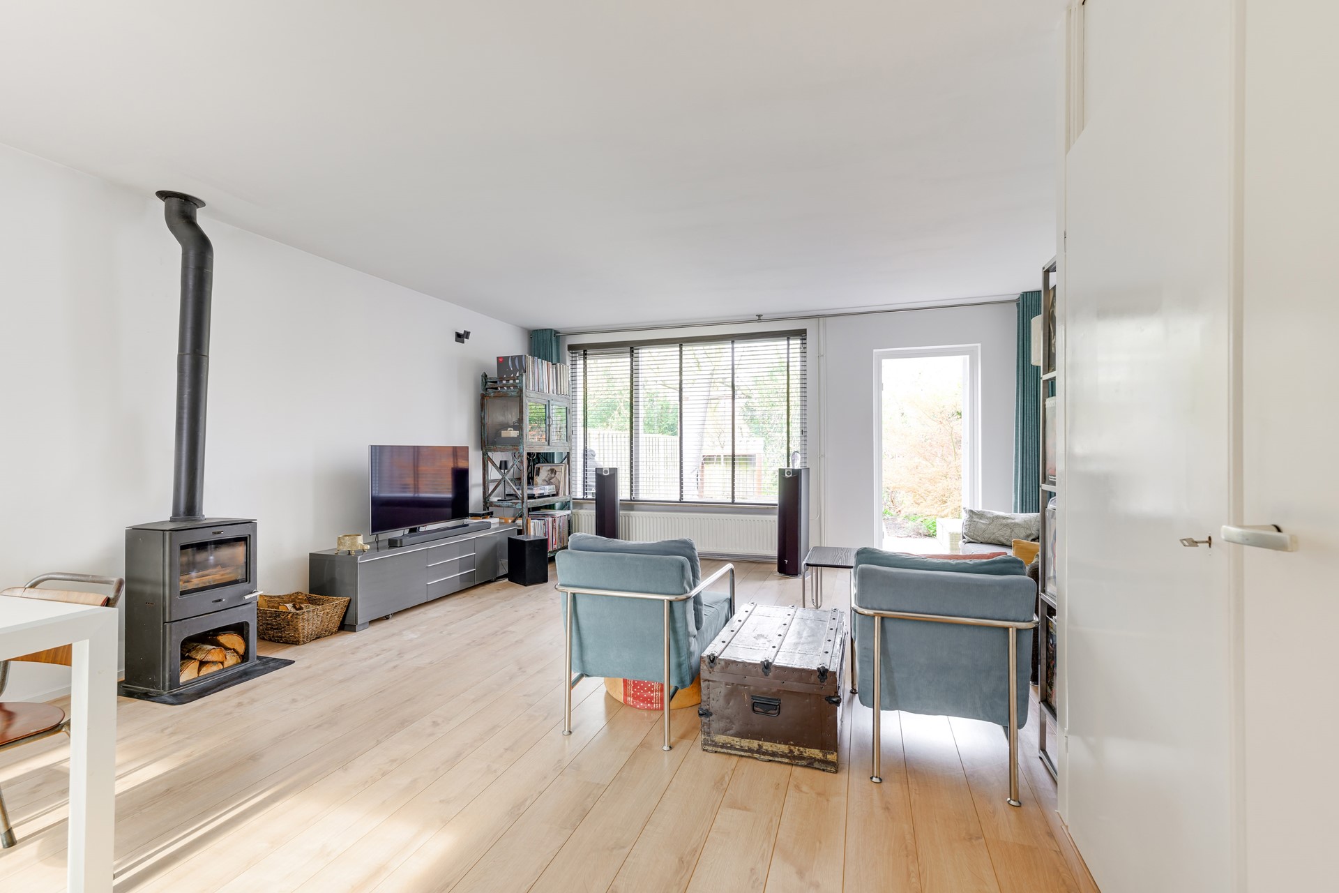 Binnen valt direct de lichte en royale doorzonwoonkamer op, voorzien van grote raampartijen en een sfeervolle houtkachel. De open keuken aan de voorzijde is praktisch ingericht en biedt prettig zicht op de straat.