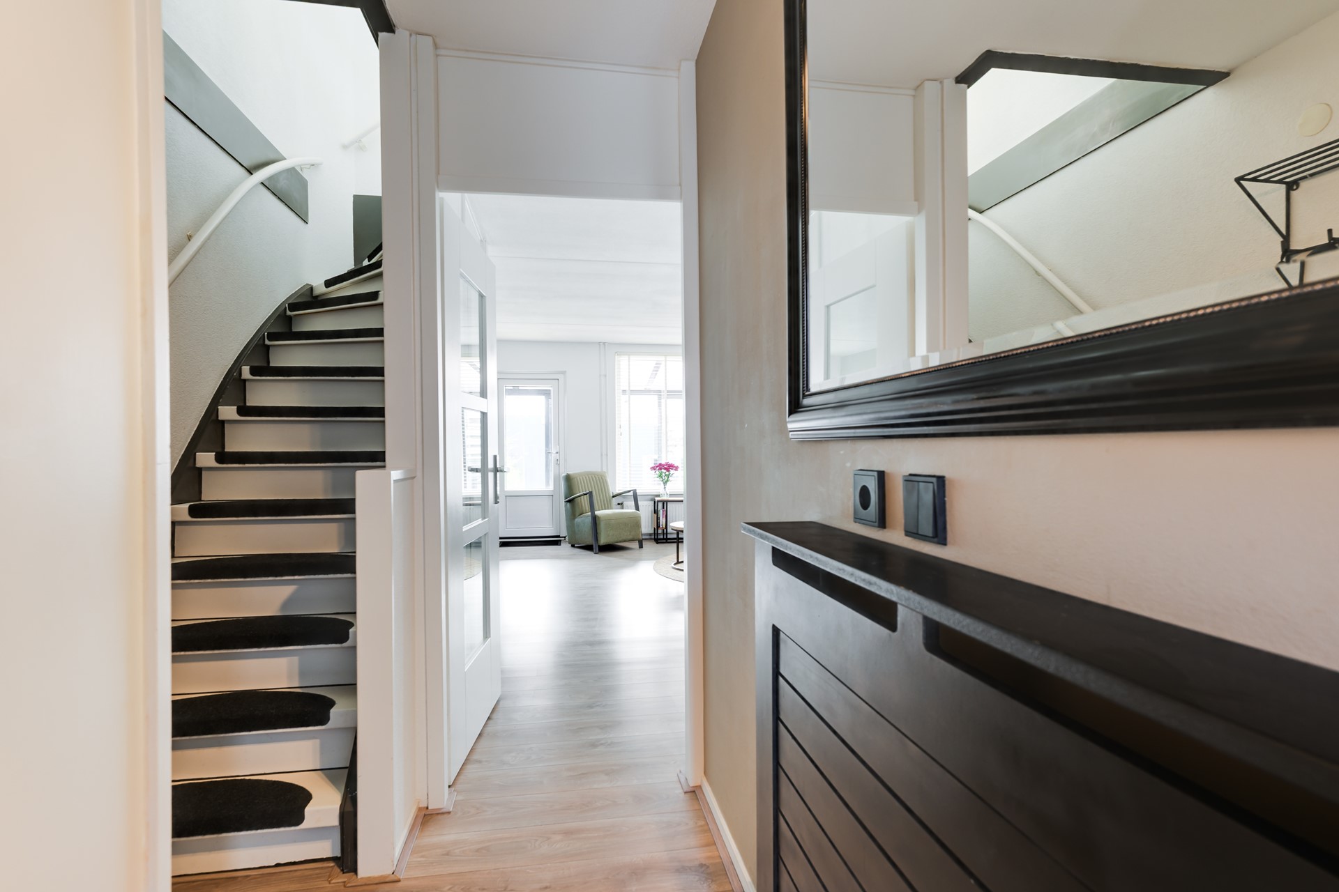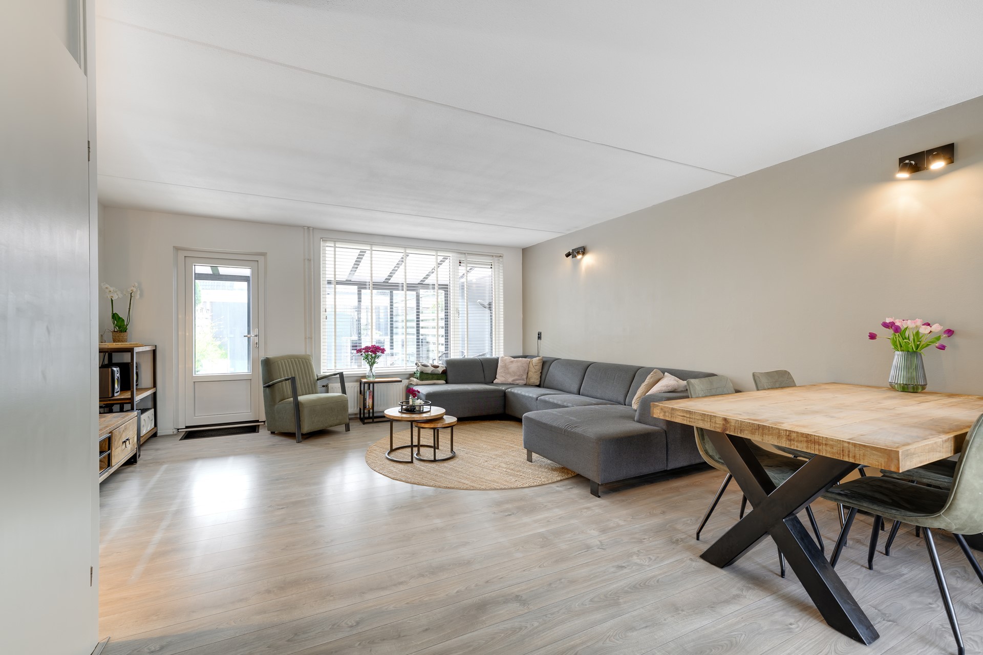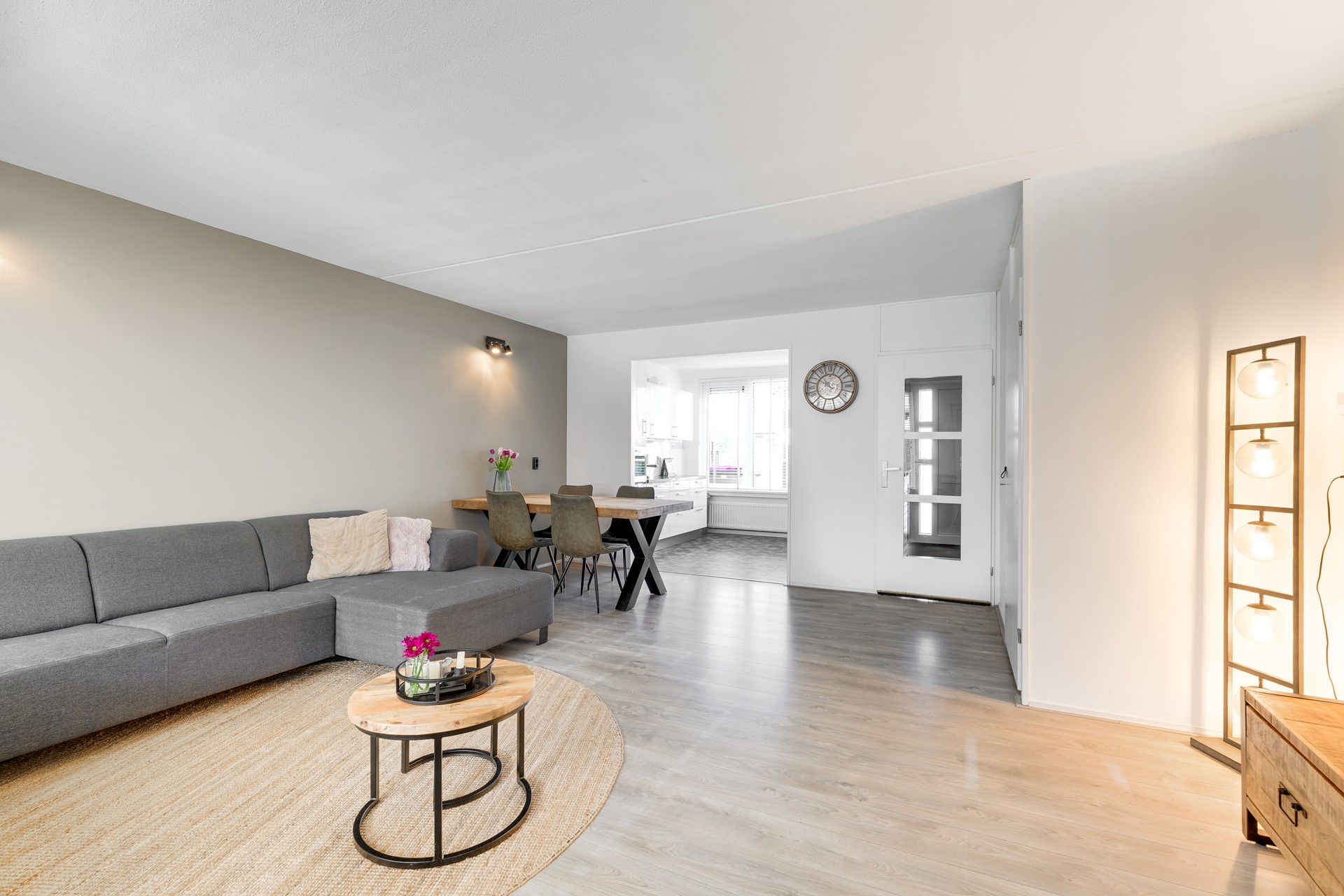 Via de voortuin – met mogelijkheid tot parkeren op eigen terrein – bereik je de entree van de woning. In de hal bevinden zich het moderne toilet en de trapopgang. De tuingerichte woonkamer is licht en sfeervol en vormt samen met de eetkamer een fijne leefruimte. Grote raampartijen zorgen voor een prettige hoeveelheid daglicht en een mooie verbinding met buiten.