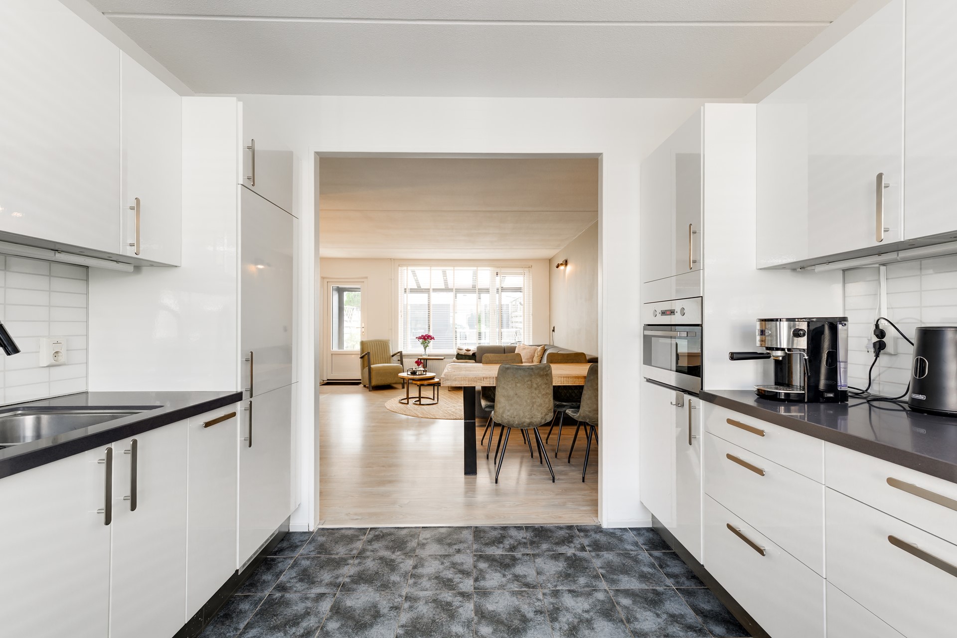 De open keuken bevindt zich aan de voorzijde van de woning en is uitgevoerd in een moderne stijl met diverse inbouwapparatuur. Dankzij de praktische indeling blijf je tijdens het koken altijd in contact met het woongedeelte.