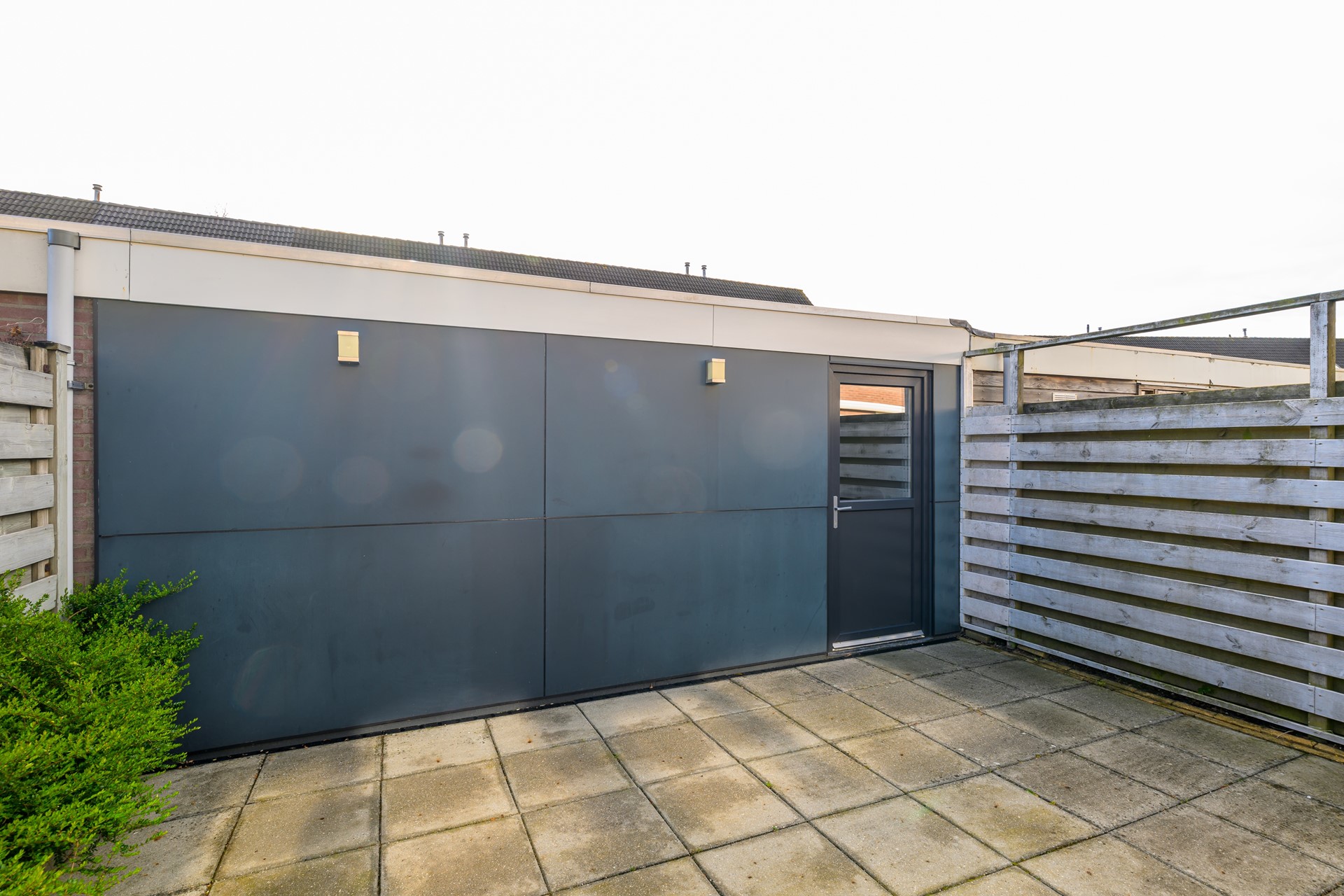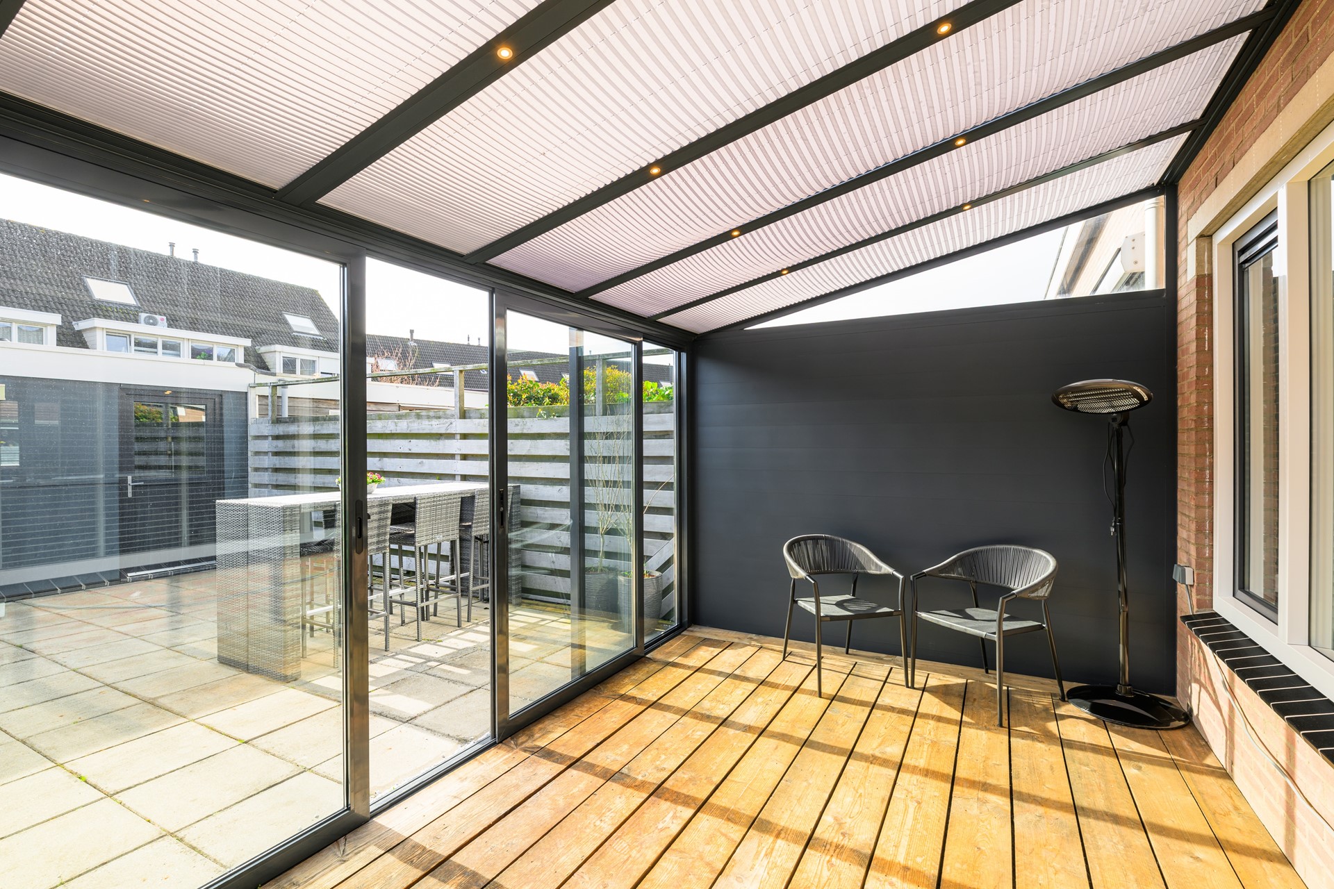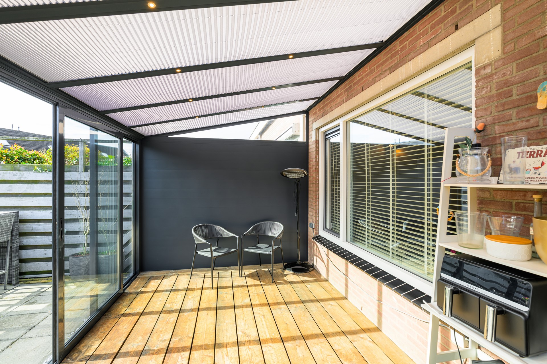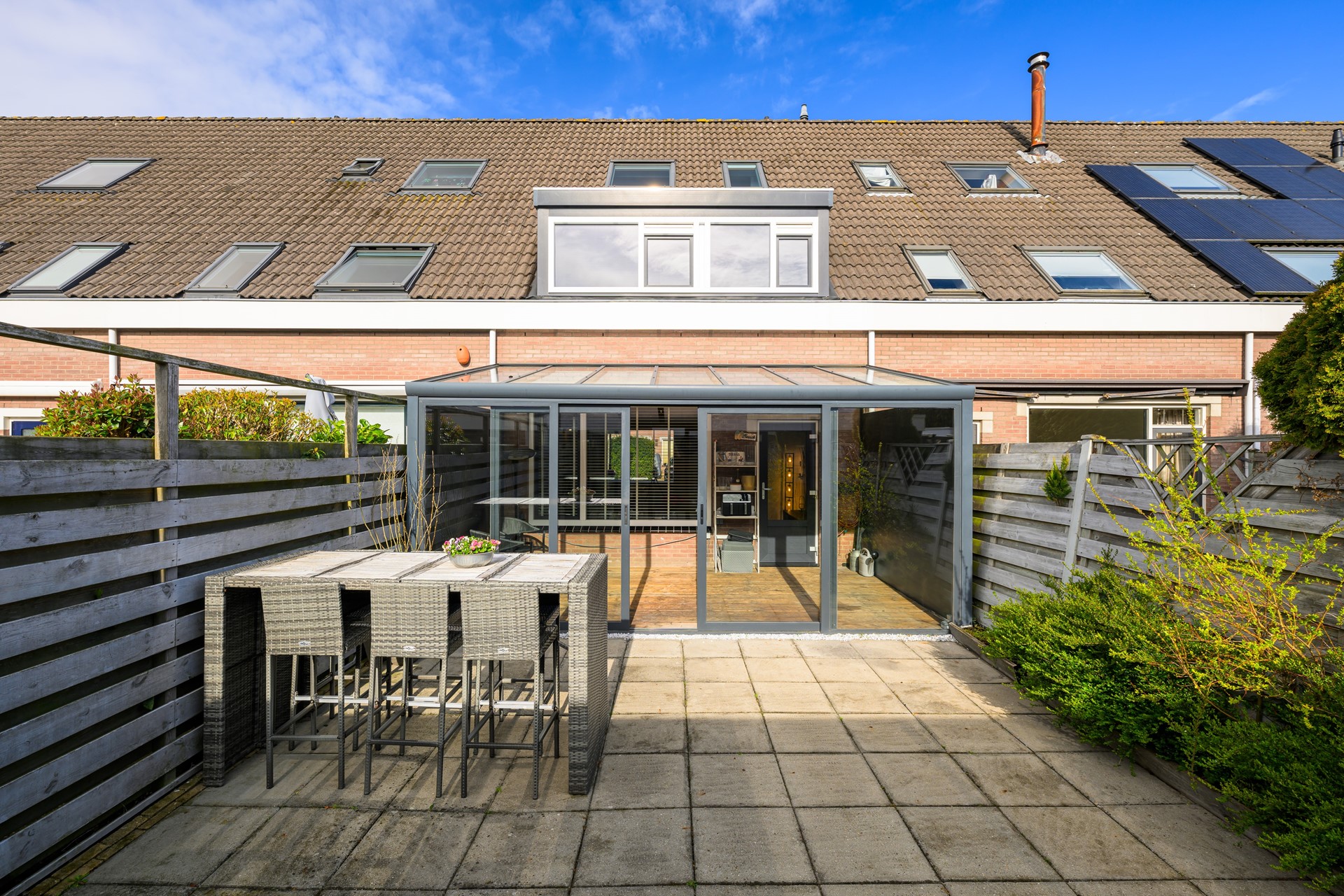 Aan de achterzijde bevindt zich de lichte serre met houten vloer en inbouwverlichting – een heerlijke extra leefruimte waar je het hele jaar door kunt genieten van het buitengevoel. Via de schuifdeur bereik je de zonnige achtertuin op het zuidoosten. De tuin biedt veel privacy en beschikt over een ruime geïsoleerde berging met elektrische roldeur, ideaal voor fietsen, motor of extra opslag.