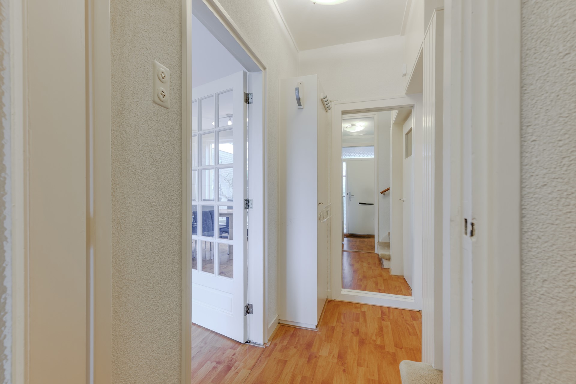 De voortuin biedt een verzorgde entree en een prettige zitplek. Binnen valt direct het lichte en ruimtelijke karakter op. De royale doorzonwoonkamer profiteert van grote raampartijen aan zowel voor- als achterzijde, waardoor het daglicht rijkelijk naar binnen stroomt. De open indeling maakt het een fijne leefruimte waar wonen, eten en samenzijn moeiteloos samenkomen.