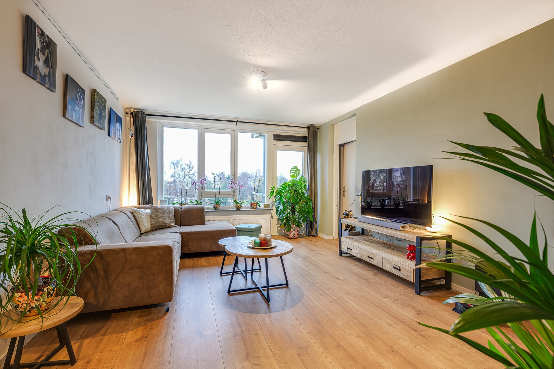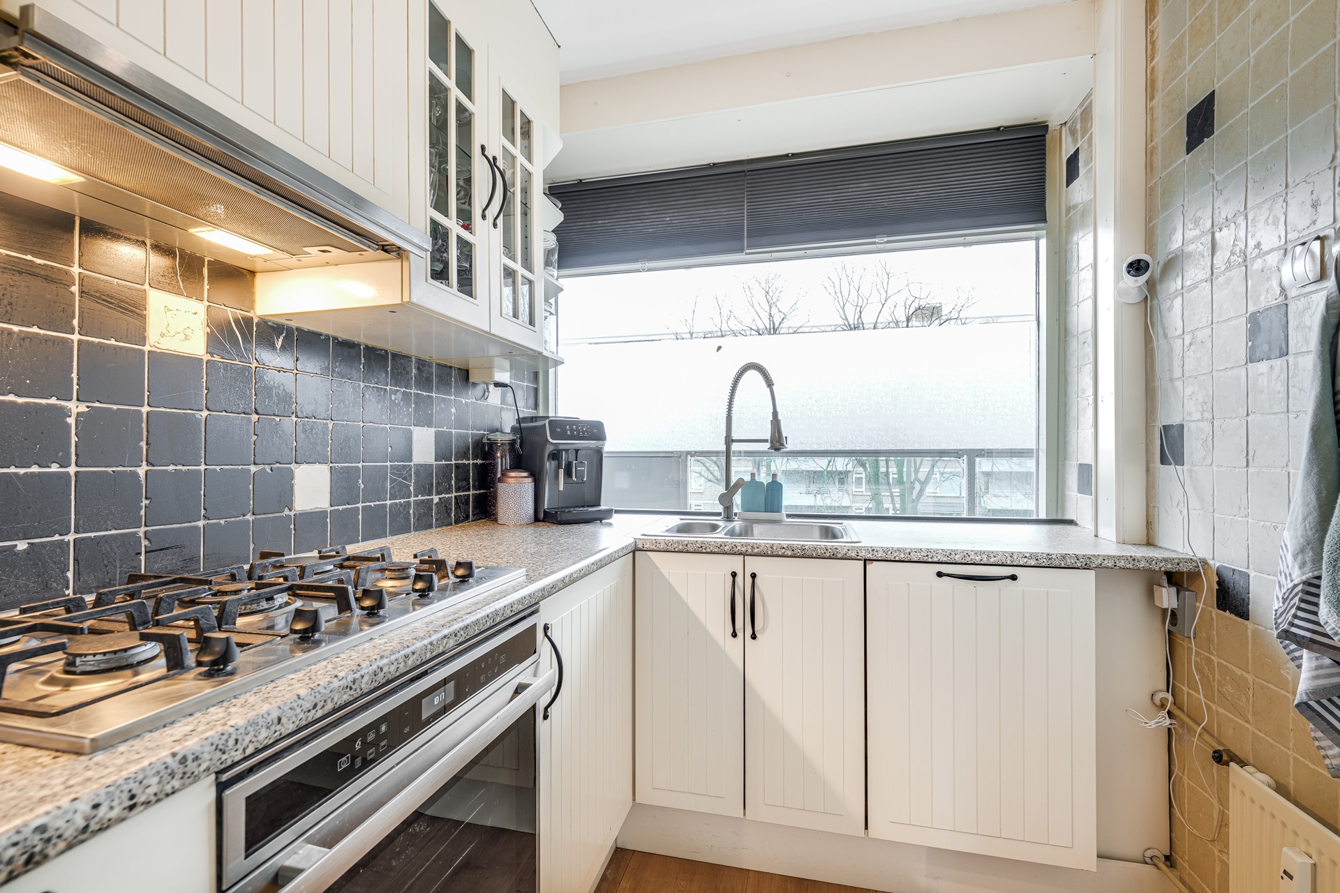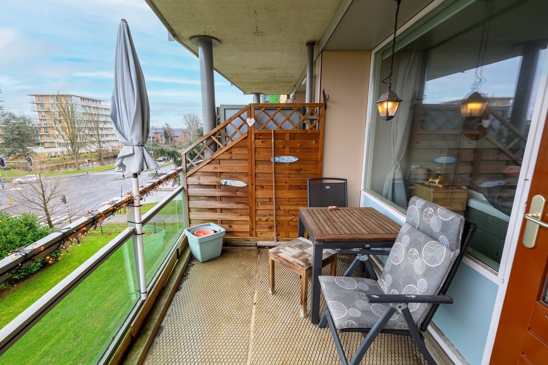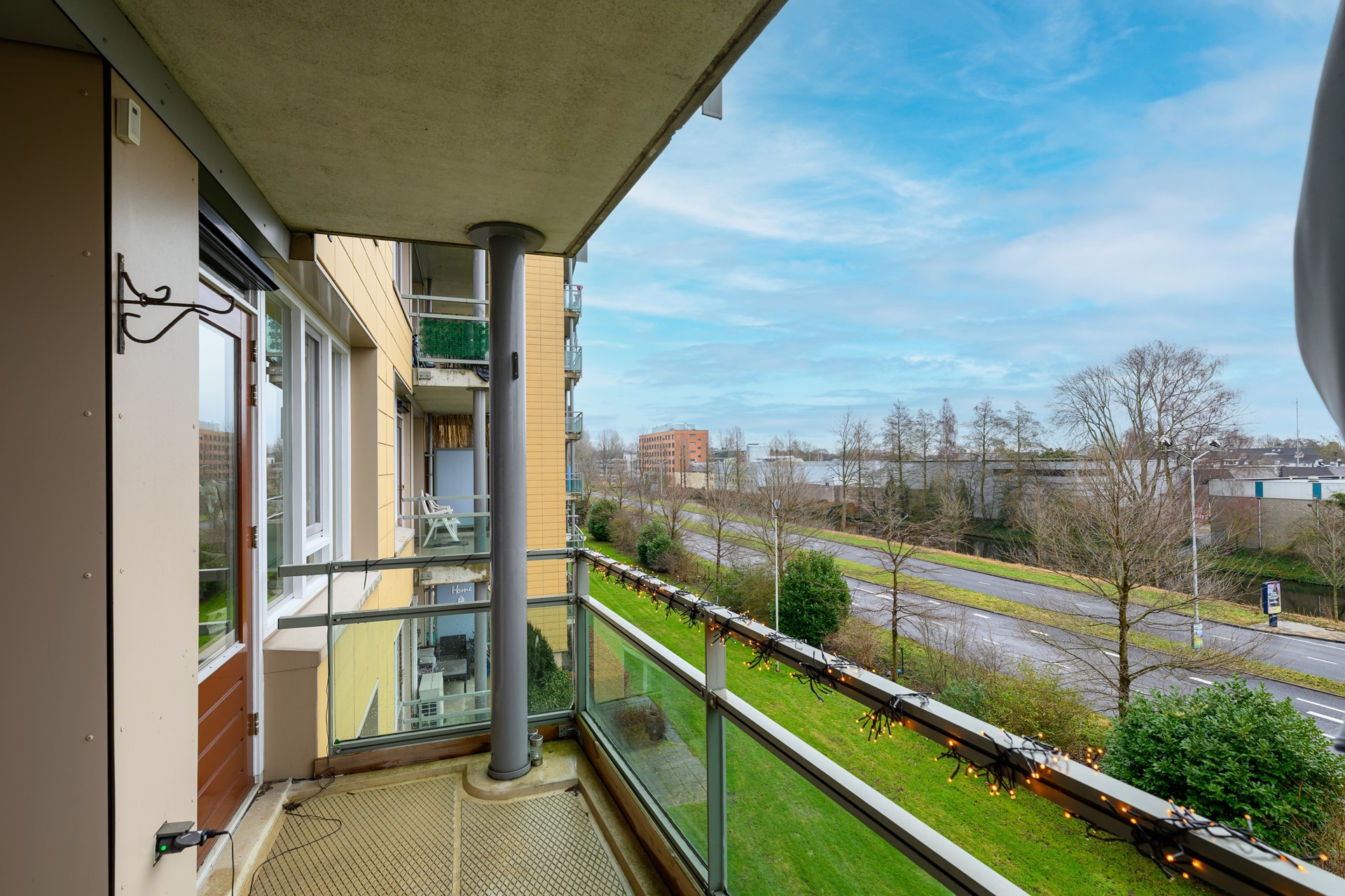 De woonkamer is ruim opgezet en opvallend licht dankzij de grote raampartijen. Vanuit de woonkamer stap je zo het balkon op, een fijne plek met open uitzicht over groen en water. De keuken is praktisch ingericht met inbouwapparatuur en veel werkruimte.