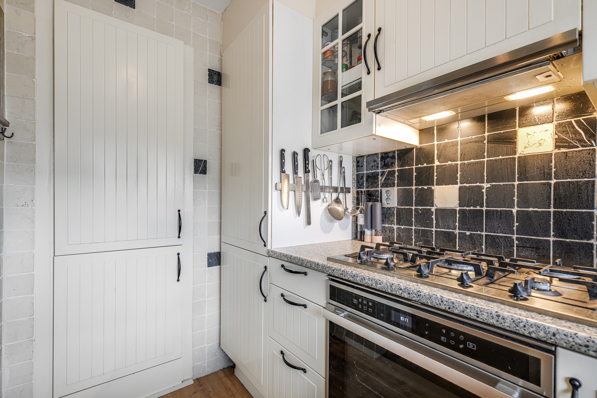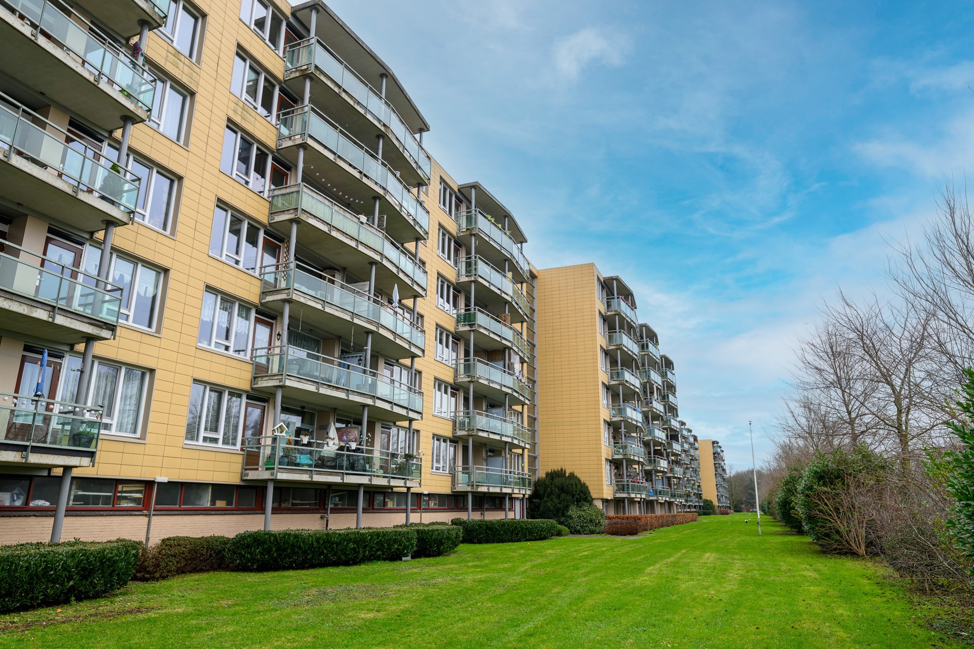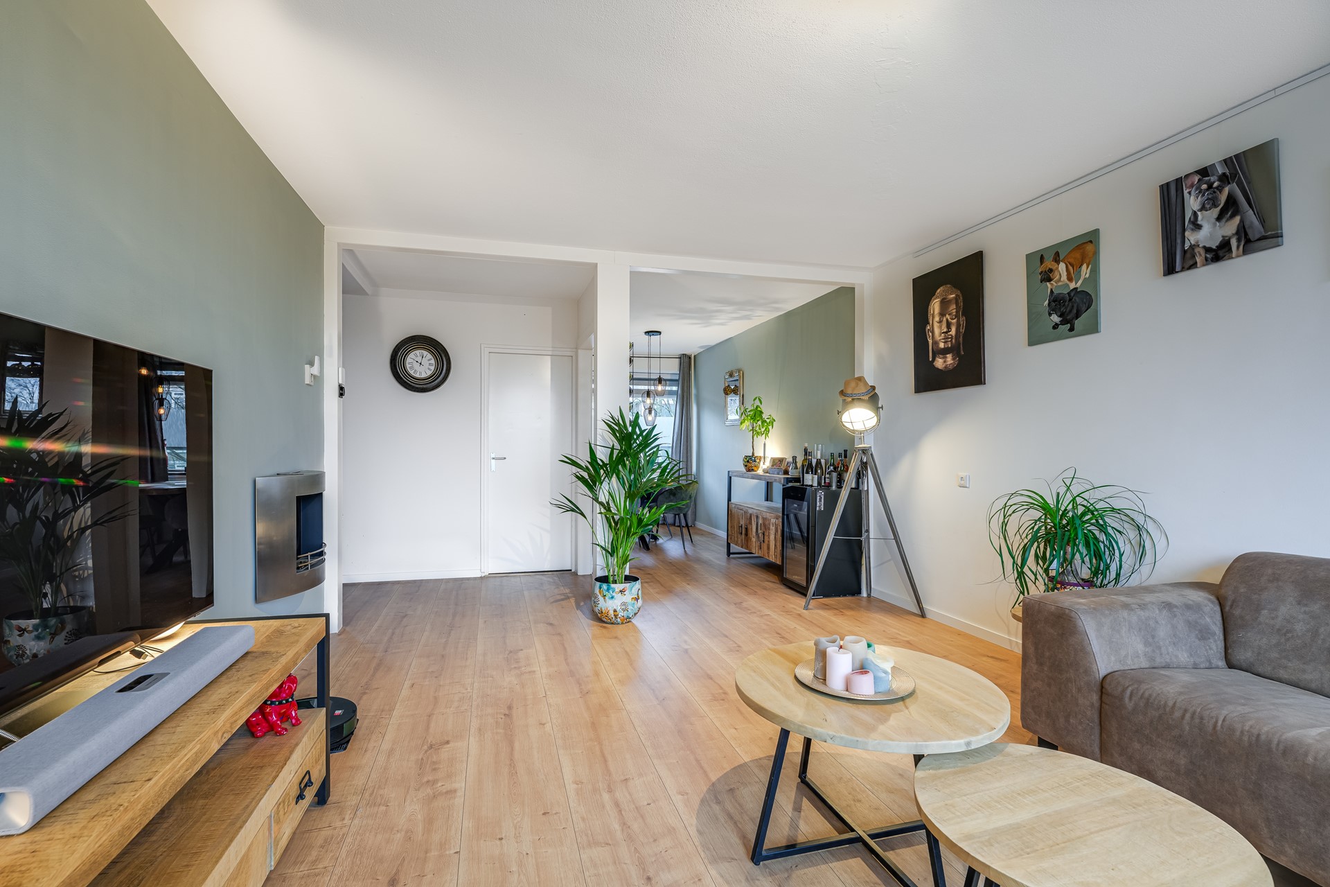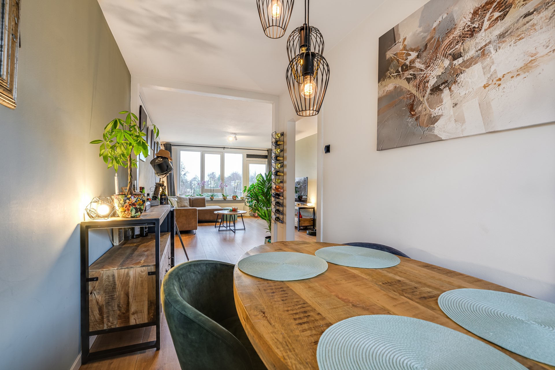 De woonkamer is ruim opgezet en opvallend licht dankzij de grote raampartijen. Vanuit de woonkamer stap je zo het balkon op, een fijne plek met open uitzicht over groen en water. De keuken is praktisch ingericht met inbouwapparatuur en veel werkruimte.