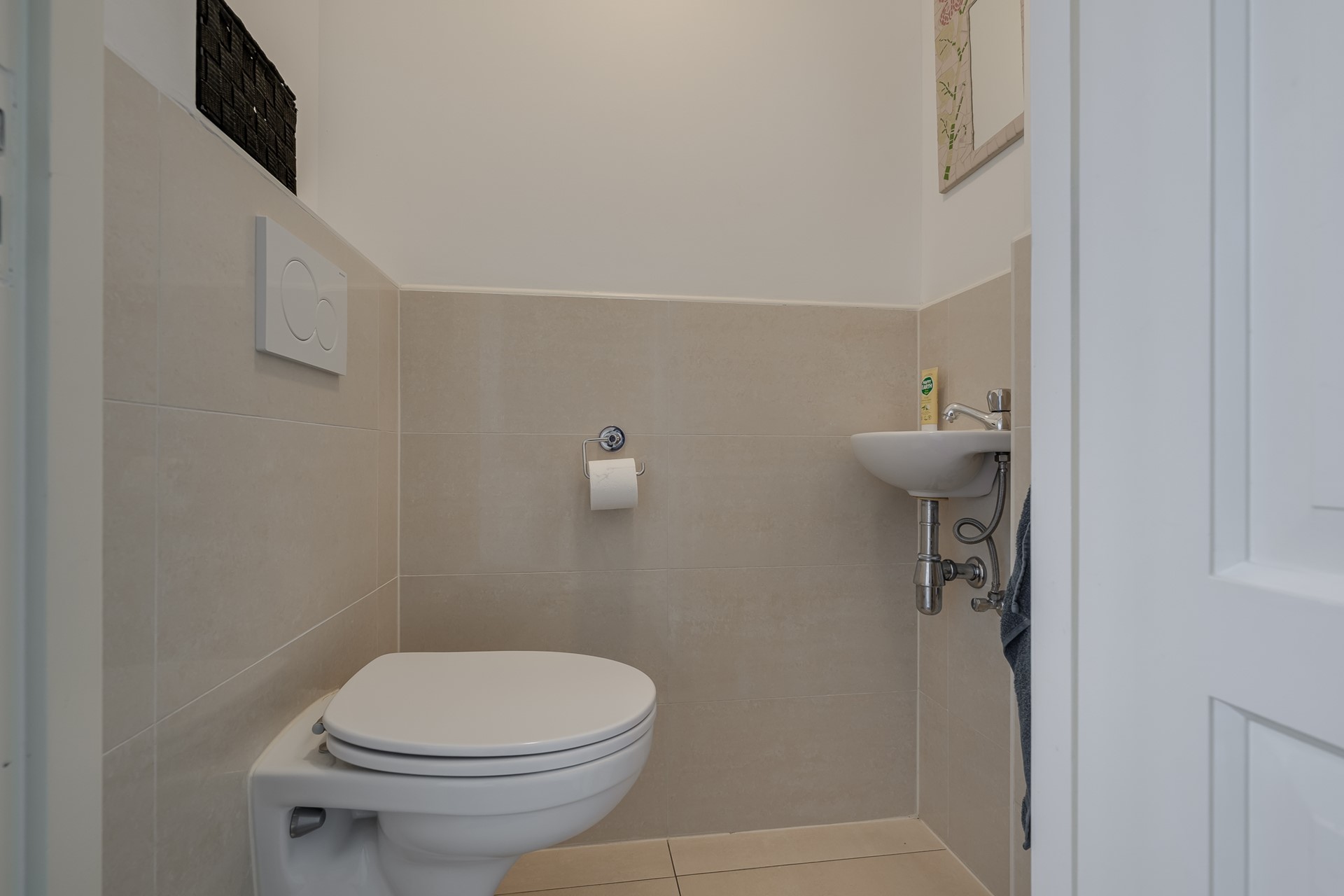 Entrance with hall, toilet and staircase. Bright and spacious living room with French doors opening onto the garden. Modern kitchen with built-in appliances, adjoining utility room with laundry setup and extra storage. From here, direct access to the integrated garage.