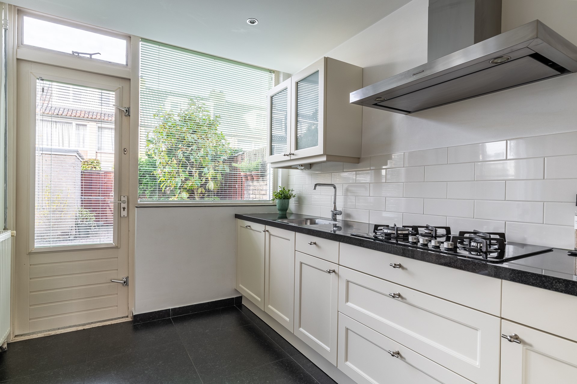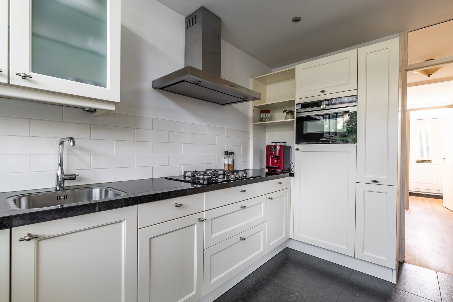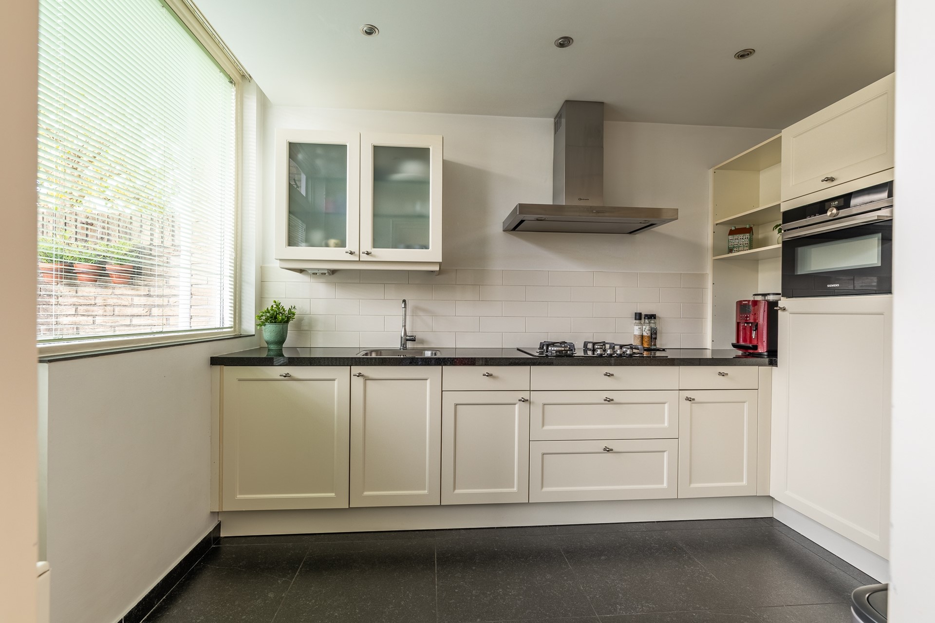 Aan de tuinzijde ligt de lichte keuken met tijdloze fronten en een hoogwaardig hardstenen blad. De brede raampartij maakt koken luchtig en ontspannen. Voorzien van: