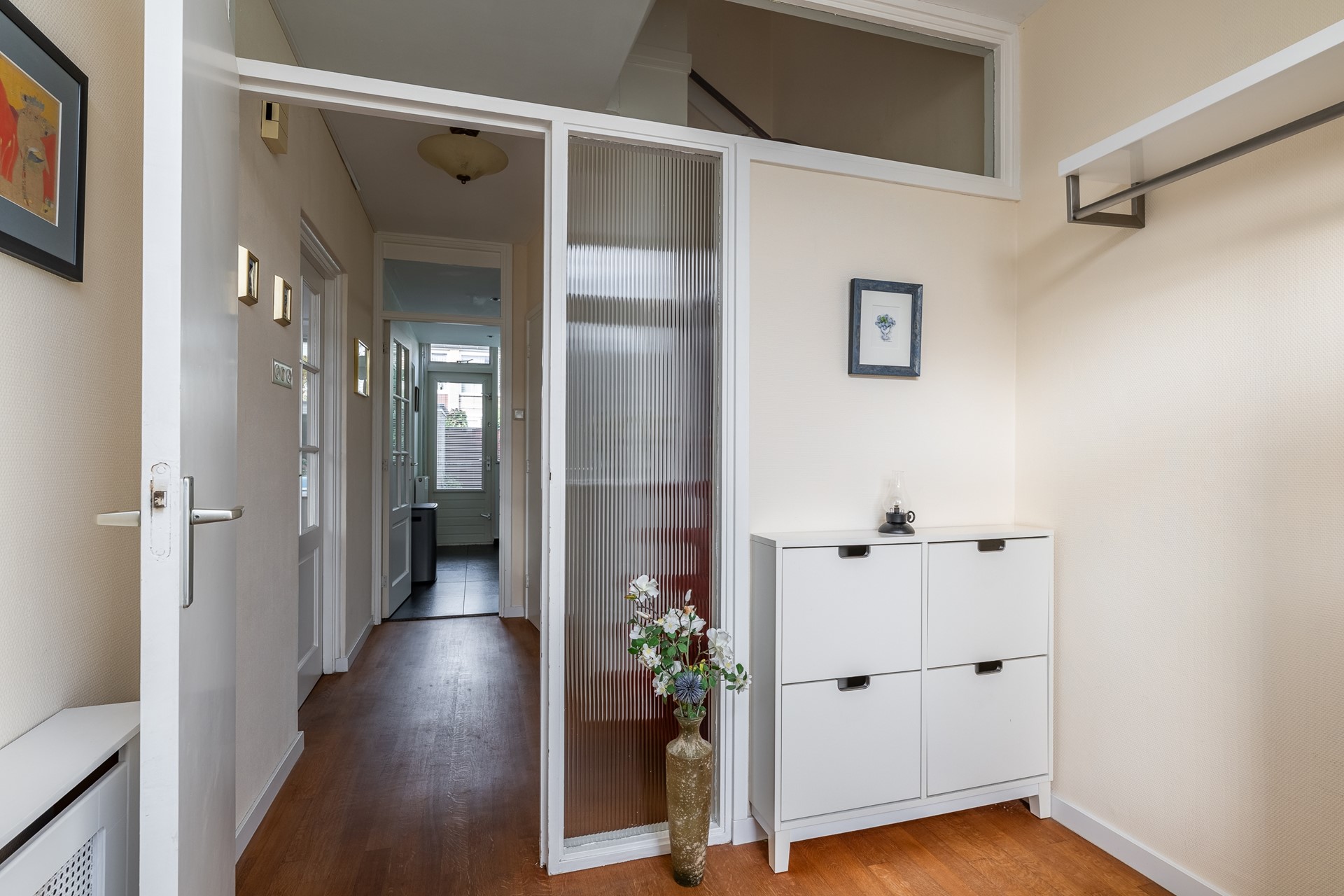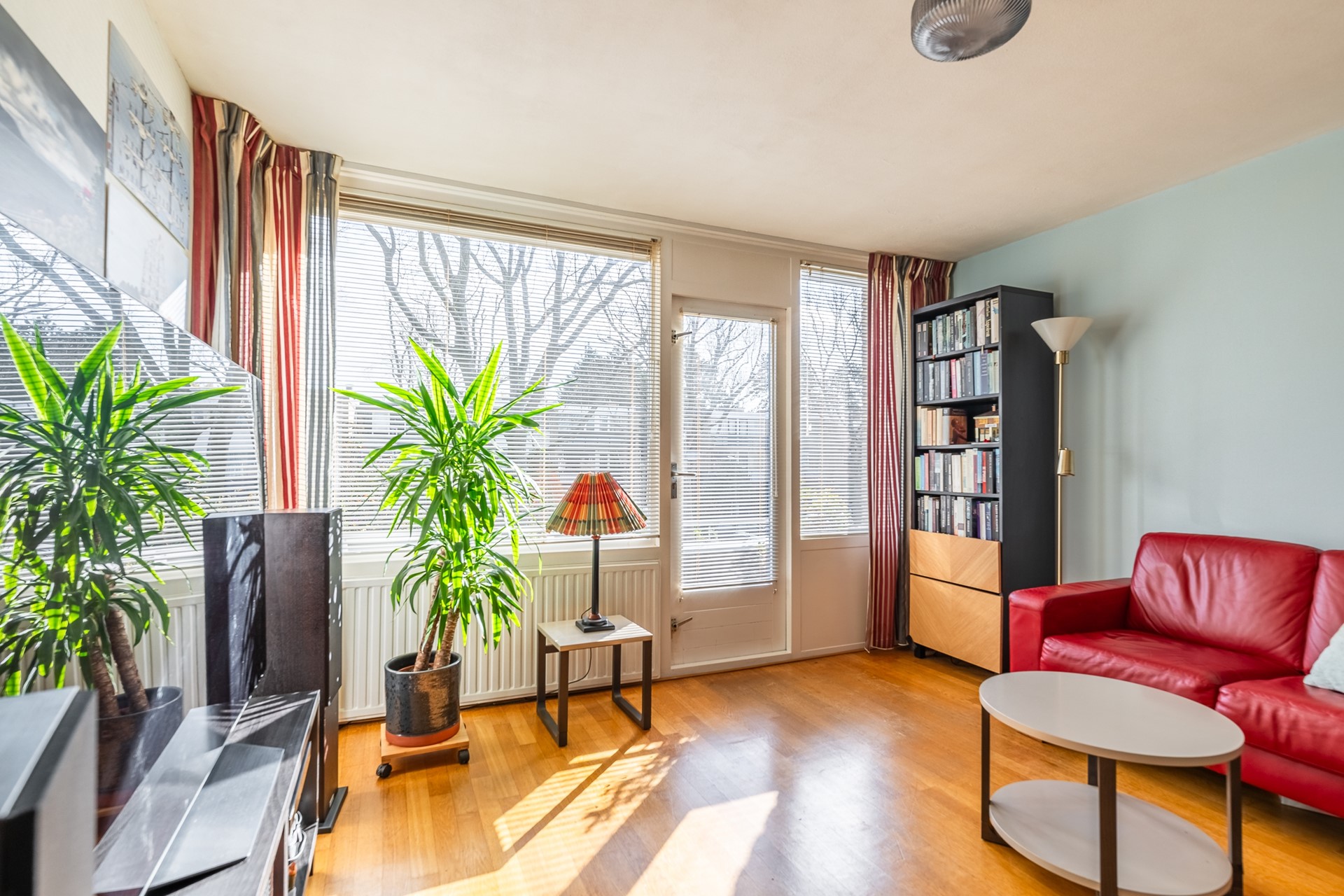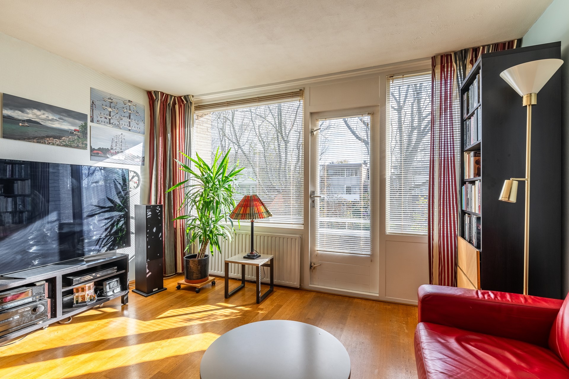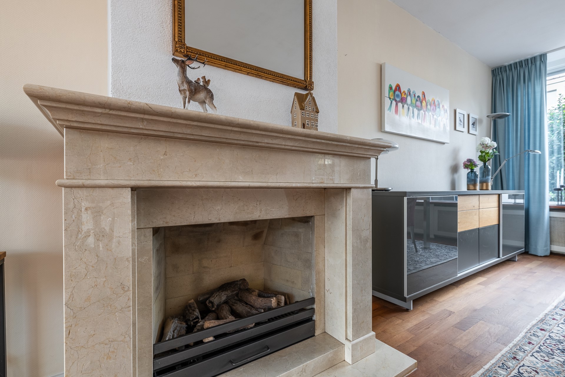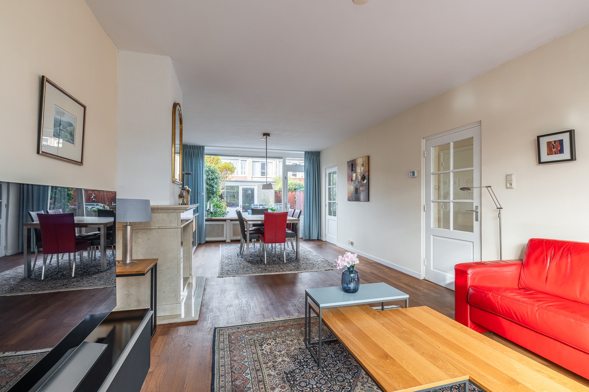 De doorzonwoonkamer strekt zich moeiteloos uit van voor naar achter. Het grote voorraam vangt de ochtendzon, terwijl je aan de achterzijde uitkijkt op het groen. De houten vloer, de lengte van de ruimte en de klassieke schouw maken dit tot een warme leefplek waar je automatisch zachter gaat praten.