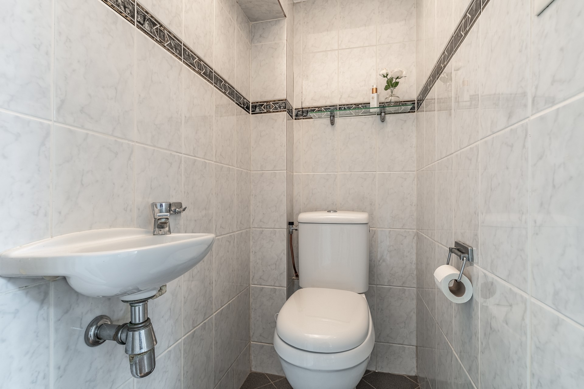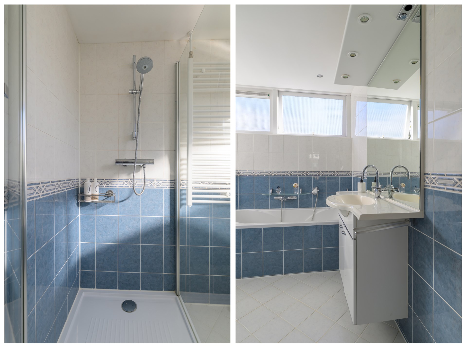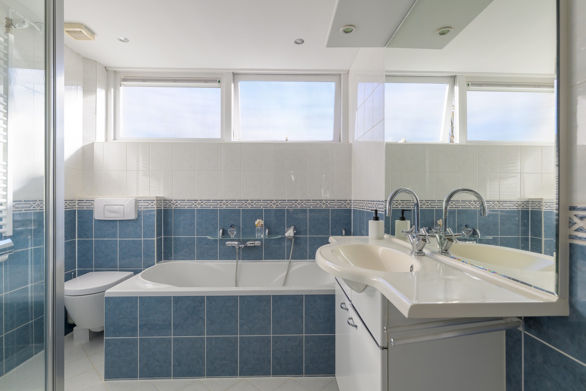 De badkamer biedt alle comfort: een ligbad, een aparte douchecabine, een tweede toilet en een royaal wastafelmeubel. De blauw-witte tegelcombinatie geeft de ruimte een frisse, klassieke uitstraling. De hoge ramen zorgen voor heerlijk daglicht zonder in te leveren op privacy.