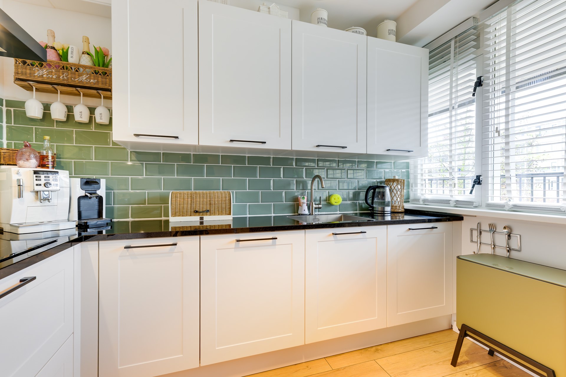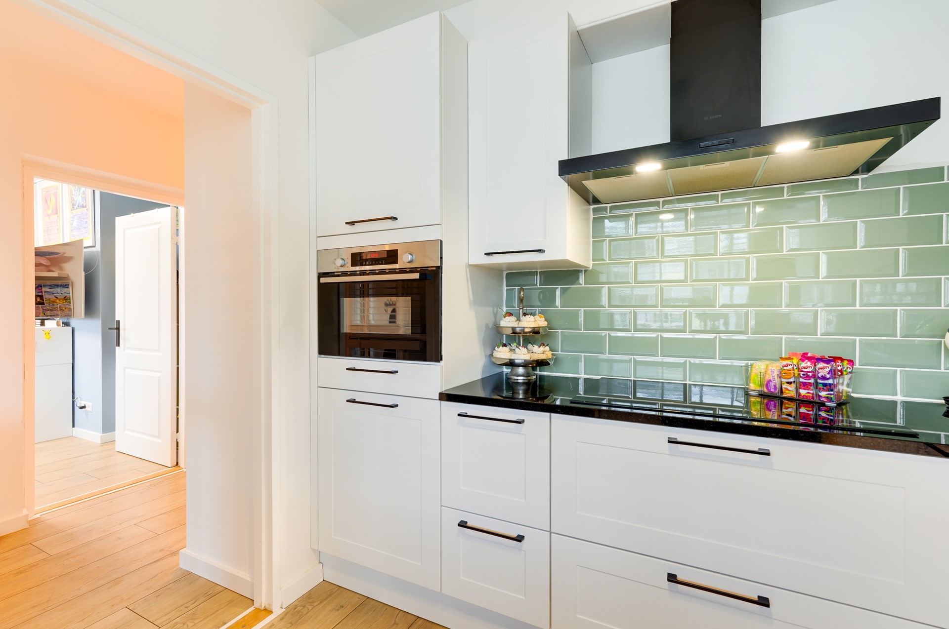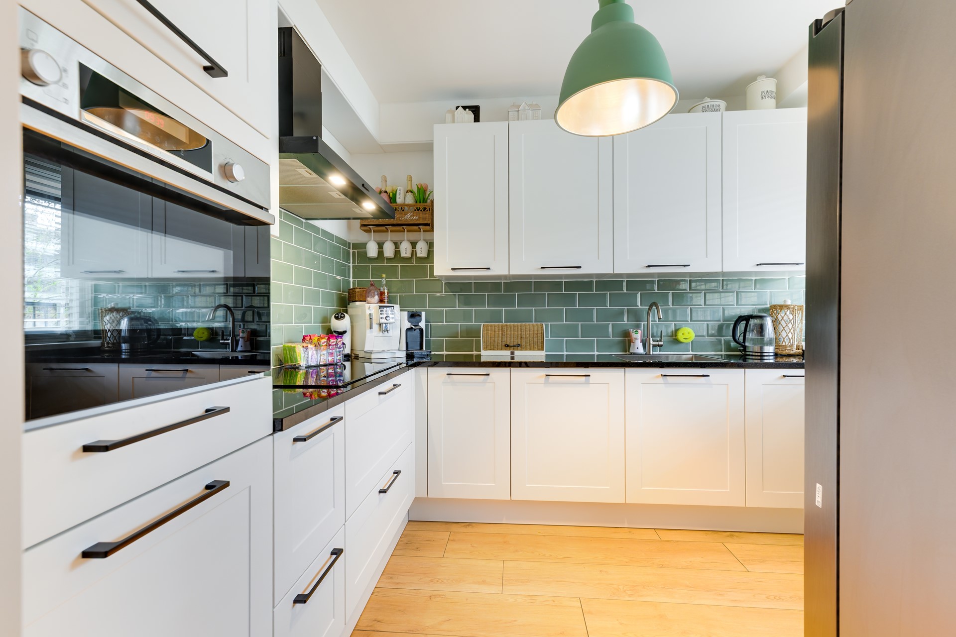 De keuken is modern uitgevoerd en praktisch ingericht, met een frisse combinatie van witte kastfronten, een donker werkblad en een karakteristieke groene tegelwand. Hier kook je met plezier, met alles binnen handbereik.