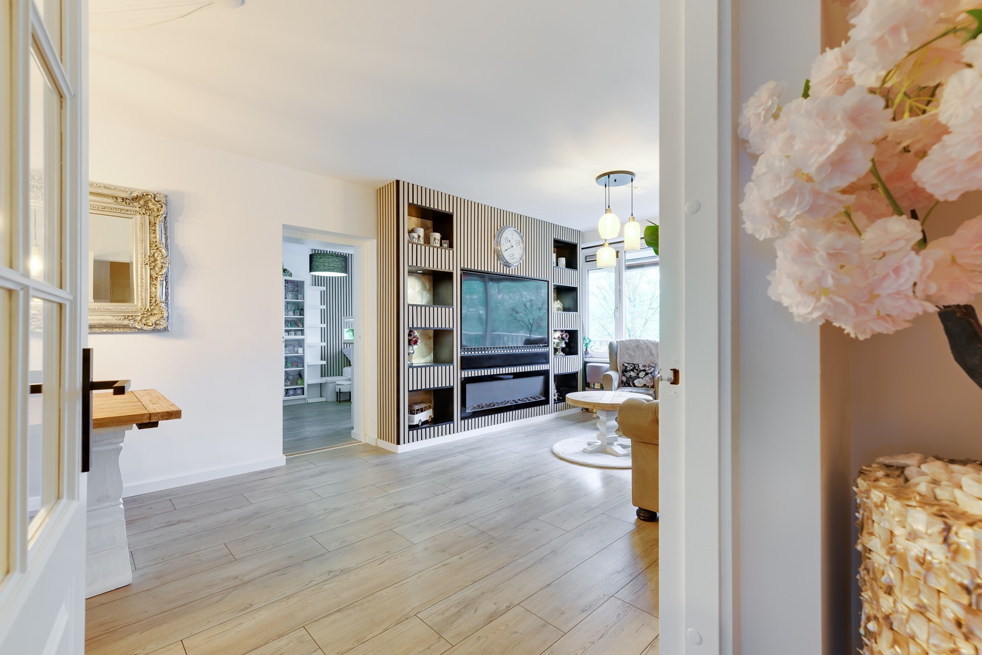 De woonkamer vormt het hart van de woning. De stijlvolle wand met geïntegreerde sfeerhaard en maatwerkkasten geeft de ruimte een warme uitstraling, terwijl de open indeling zorgt voor een prettige flow. Een plek waar je moeiteloos schakelt tussen ontspannen avonden en gezellige momenten met vrienden of familie.