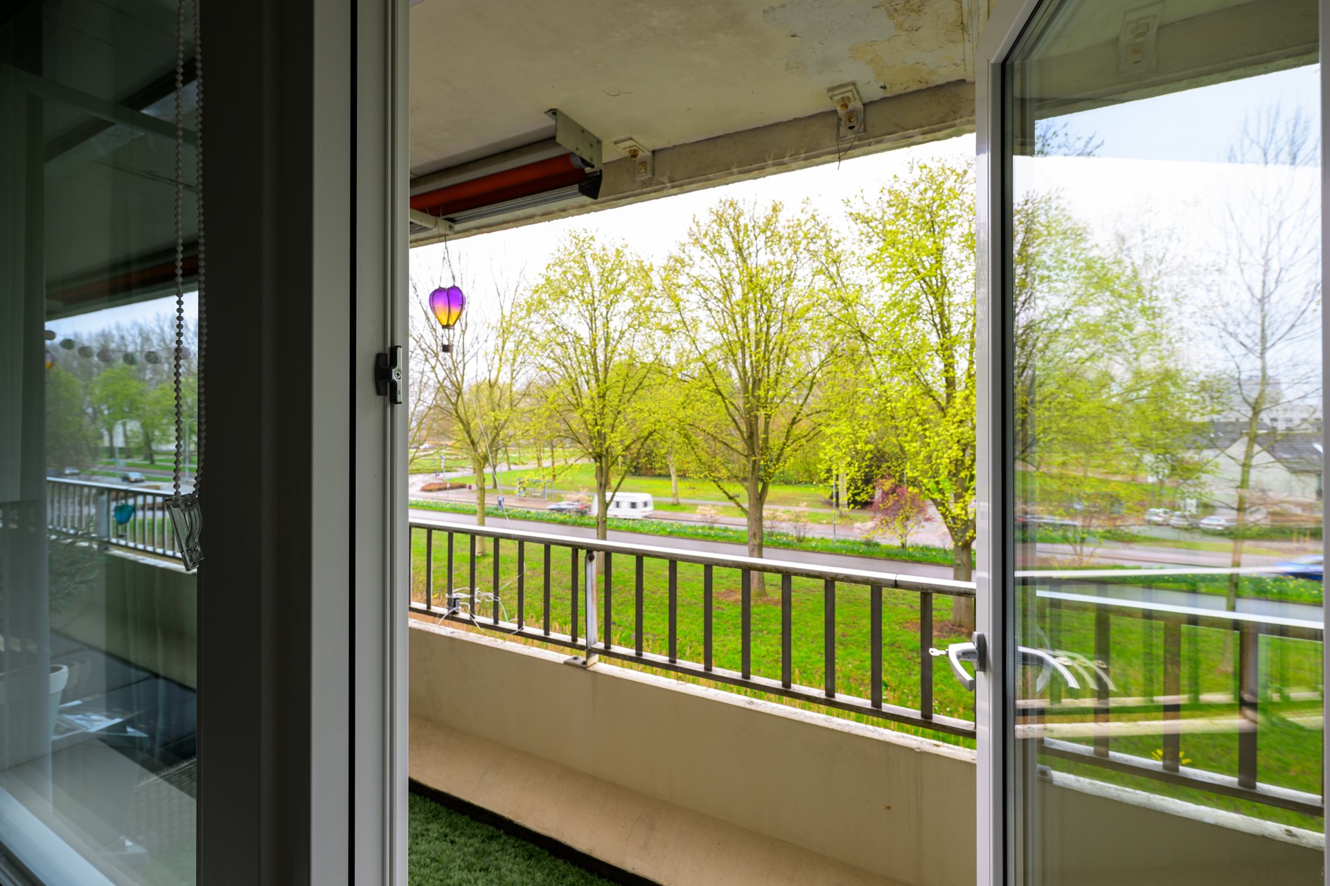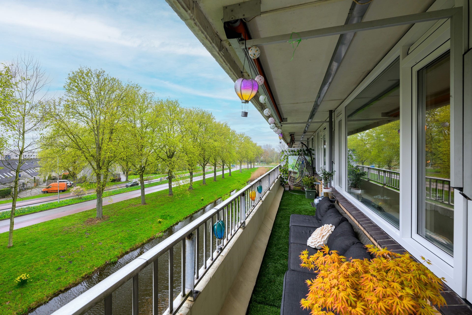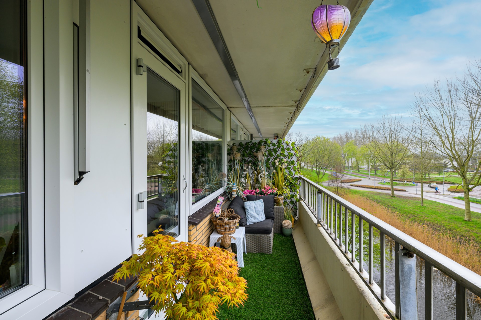 Het balkon strekt zich uit over de volledige breedte van het appartement en vormt een heerlijke verlenging van de leefruimte. Hier geniet je van een vrij uitzicht op groen en water, terwijl de dynamiek van de omgeving zich op gepaste afstand afspeelt. Een fijne plek om de dag rustig te beginnen of juist ontspannen af te sluiten.