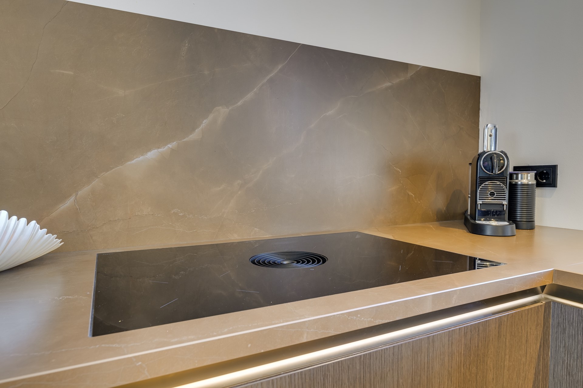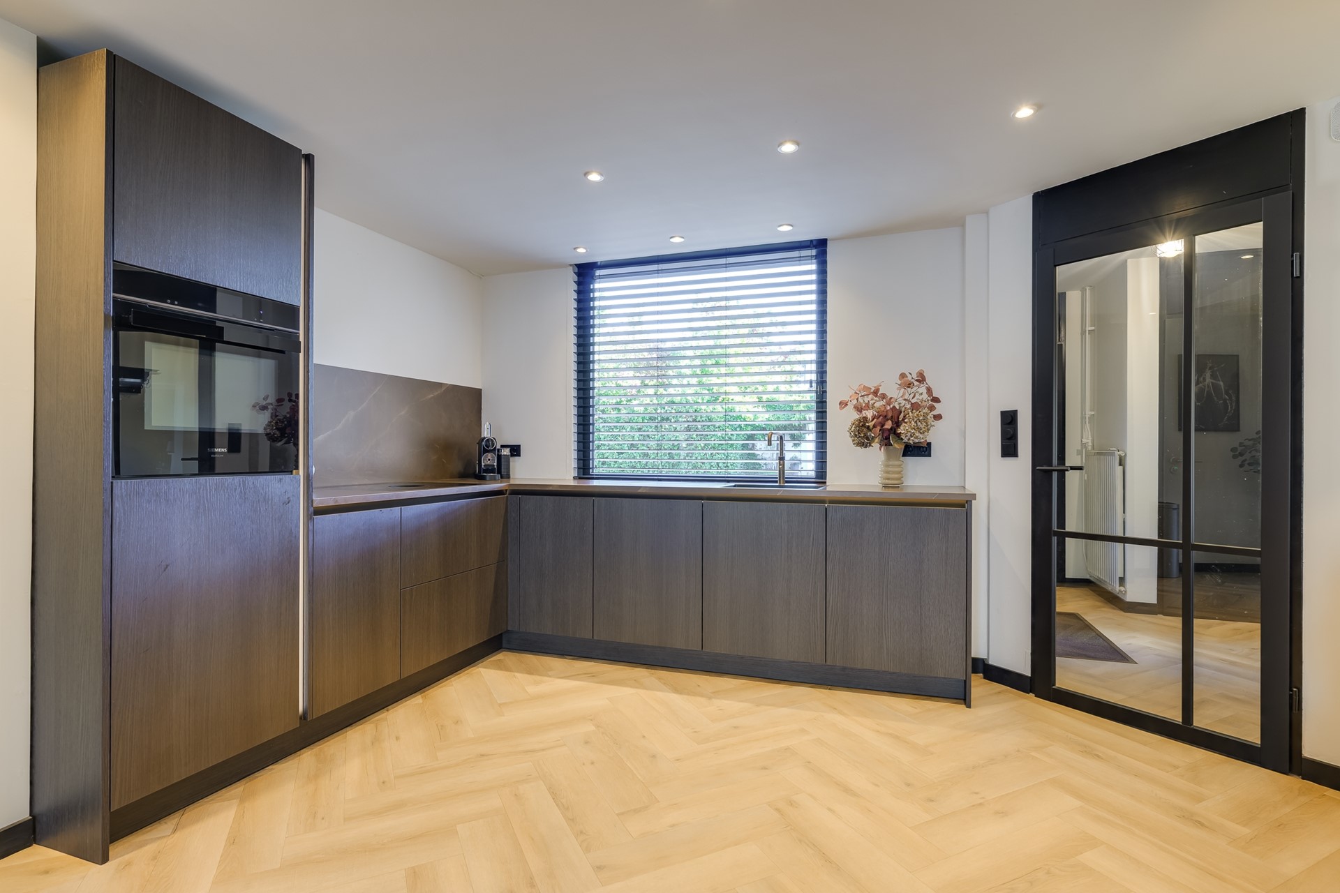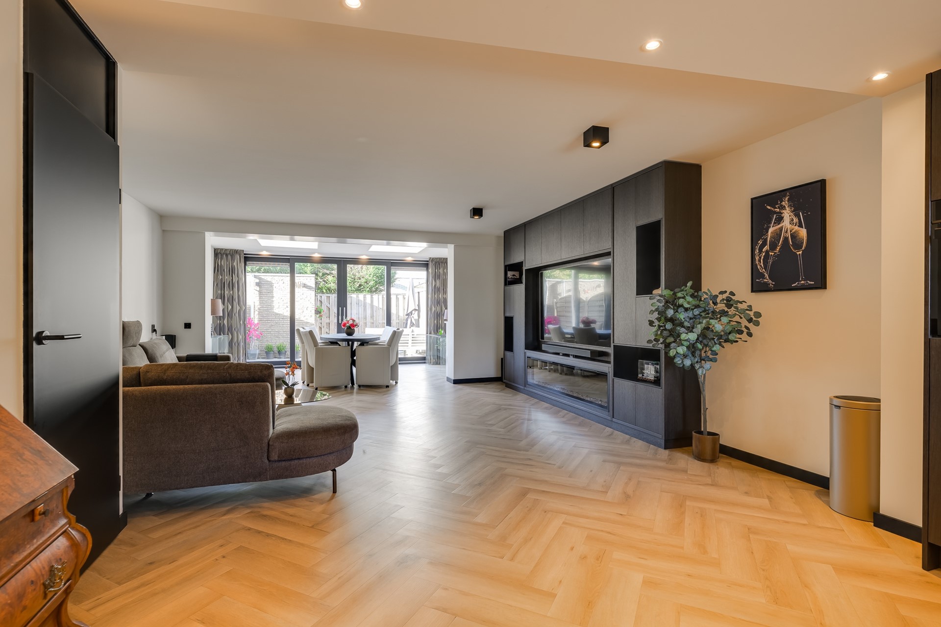 De woonkamer is echt het hart van het huis: uitgebouwd, superlicht dankzij de lichtkoepels en afgewerkt met een pvc-vloer in visgraat mét vloerverwarming. De maatwerk tv-wand sluit perfect aan bij de Siematic keuken en geeft de ruimte een moderne, luxe uitstraling. Door de openslaande deuren loop je zo de zonnige tuin in, waar de kinderen spelen en jij met een goed glas wijn geniet van de laatste zonnestralen. Zuidwesten, dus gegarandeerd die gouden avondzon.
