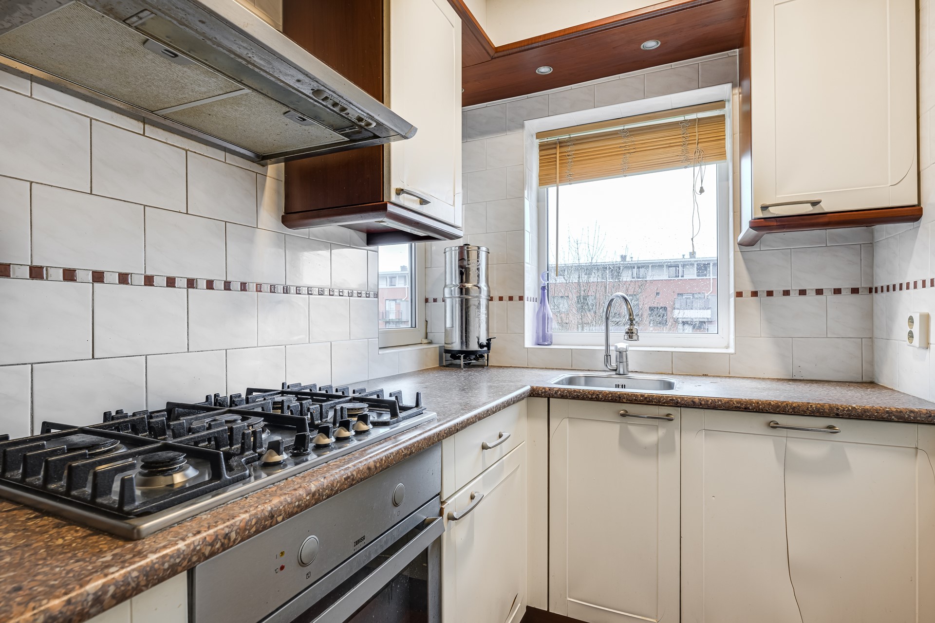 De woonverdieping vormt het hart van de woning. De royale woonkamer biedt volop ruimte voor een comfortabele zithoek én een grote eettafel. Dankzij de brede raampartijen valt het daglicht hier rijkelijk naar binnen, wat zorgt voor een prettige, open sfeer. De keuken ligt praktisch naast de woonkamer en geeft toegang tot het balkon: een fijne plek voor een koffiemoment in de ochtendzon of een ontspannen borrel aan het einde van de dag.