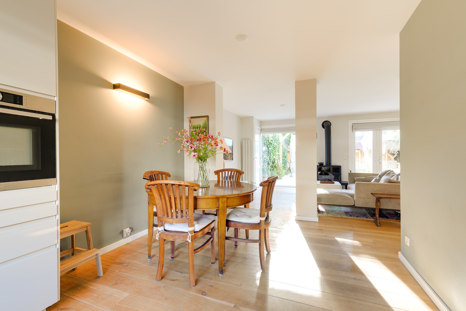 Bij binnenkomst valt direct de verzorgde afwerking op. De ruime woonkamer heeft veel lichtinval en een prettige verbinding met de tuin. De sfeervolle houtkachel zorgt voor extra warmte en karakter in de leefruimte. De woonkamer staat in open verbinding met de moderne keuken, uitgevoerd in een strak en tijdloos ontwerp met diverse inbouwapparatuur en een groot raam dat zorgt voor veel daglicht.