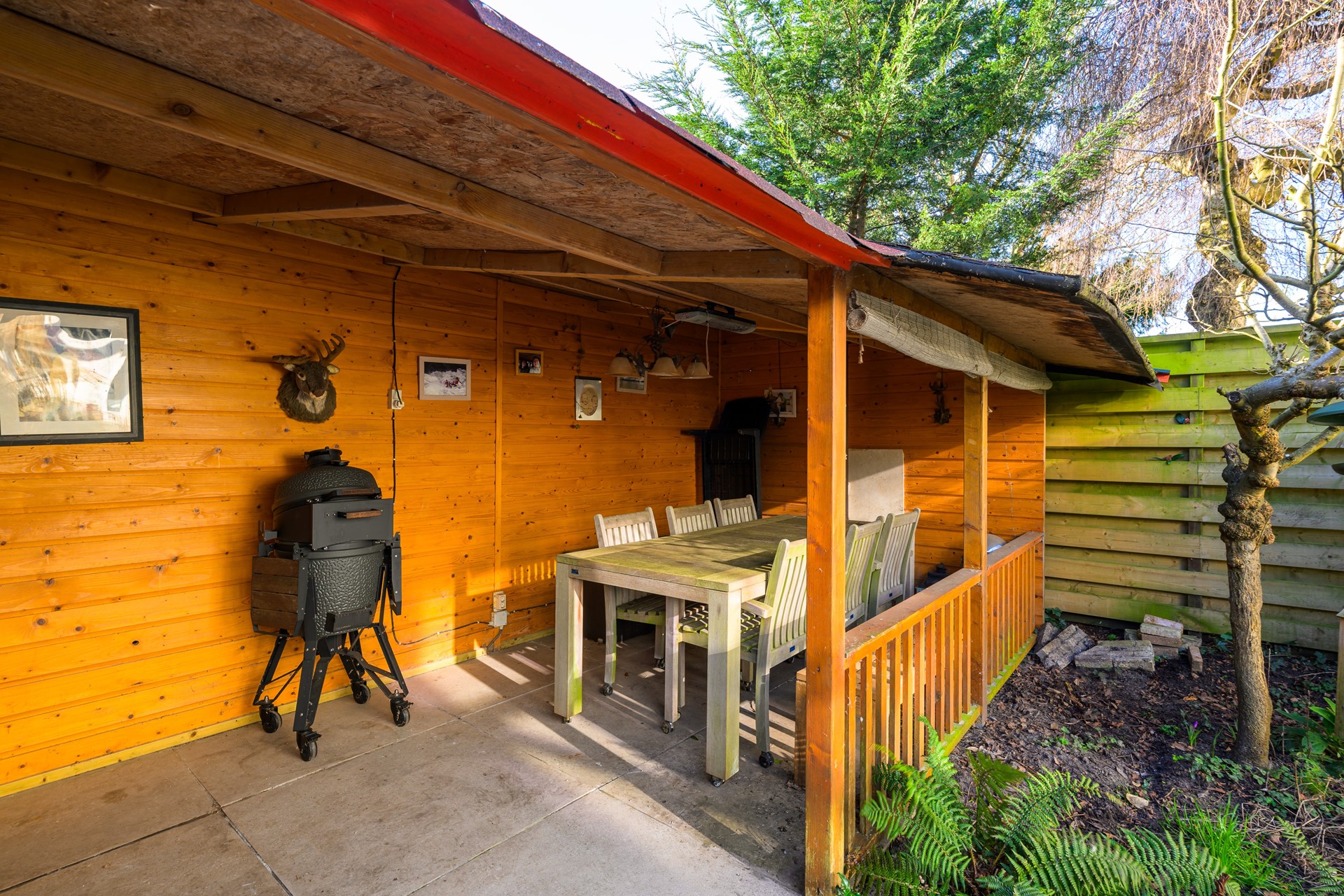 Achter in de tuin bevindt zich een ruim tuinchalet van circa 18 m² met houtkachel. Deze ruimte is ideaal als werkplek, atelier, hobbyruimte of gezellige loungeplek. Daarnaast is er een praktische vrijstaande berging van circa 9 m².