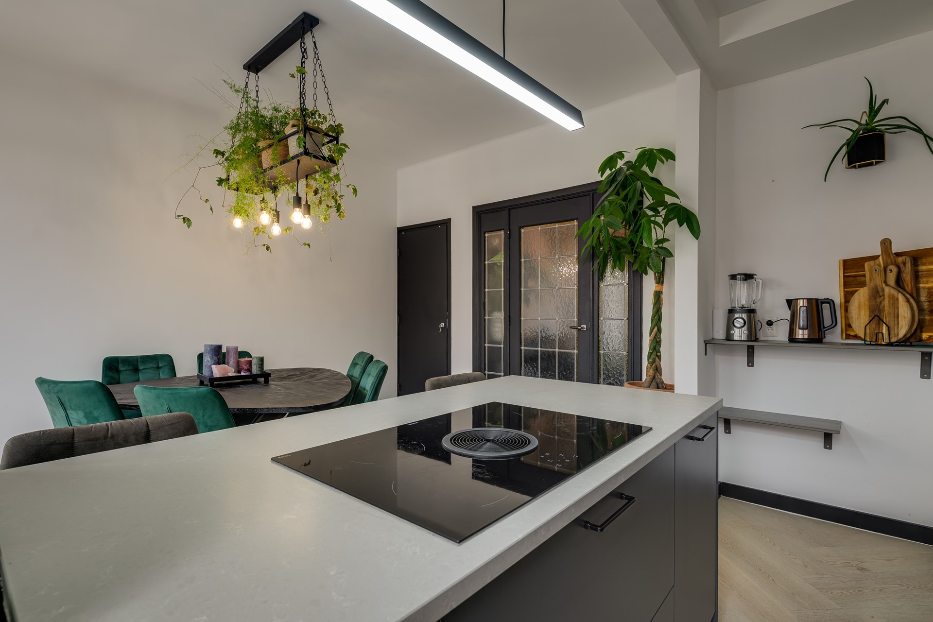 Aan de achterzijde vind je de echte eyecatcher: de ruime woonkeuken met kookeiland. Denk aan koken terwijl je vrienden of gezin aanschuiven aan de bar, of lange avonden tafelen in de eetruimte. Dankzij de openslaande deur stap je zo naar het balkon op het noordoosten – perfect voor een kop koffie in de ochtendzon.